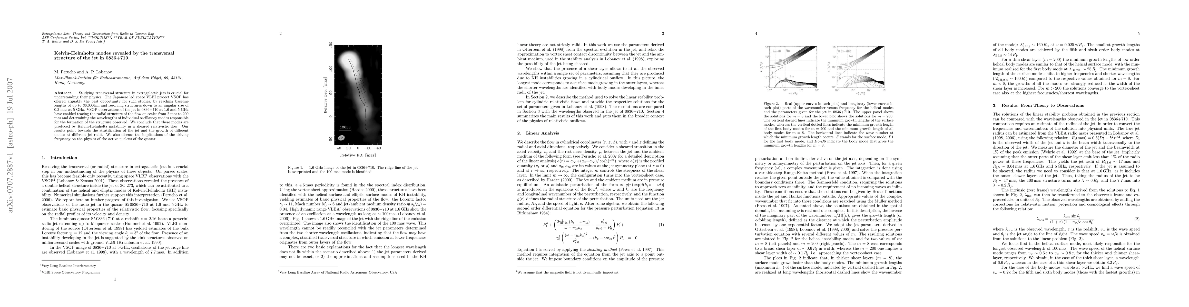 Studying transversal structure in extragalactic jets is crucial for understanding their physics. The Japanese led space VLBI project VSOP has offered arguably the best opportunity for such studies, by reaching baseline lengths of up to 36,000 km and resolving structures down to an angular size of 0.3 mas at 5 GHz. VSOP observations of the jet in 0836+710 at 1.6 and 5 GHz have enabled tracing the radial structure of the flow on scales from 2 mas to 200 mas and determining the wavelengths of individual oscillatory modes responsible for the formation of the structure observed. We conclude that these modes are produced by Kelvin-Helmholtz instability in a sheared relativistic flow. Our results point towards the stratification of the jet and the growth of different modes at different jet radii. We also discuss the implications of the driving frequency on the physics of the active nucleus of the quasar.