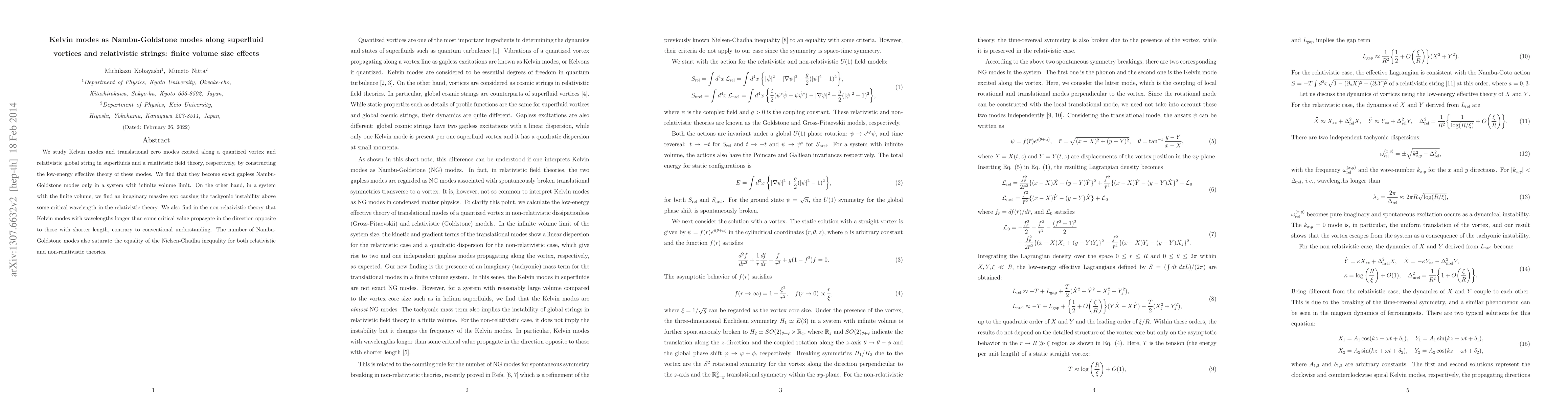 This paper investigates Kelvin modes and translational zero modes along superfluid vortices and relativistic strings, revealing they are Nambu-Goldstone modes only in infinite volume systems. In finite volume systems, the modes exhibit a tachyonic instability and unconventional propagation behavior.