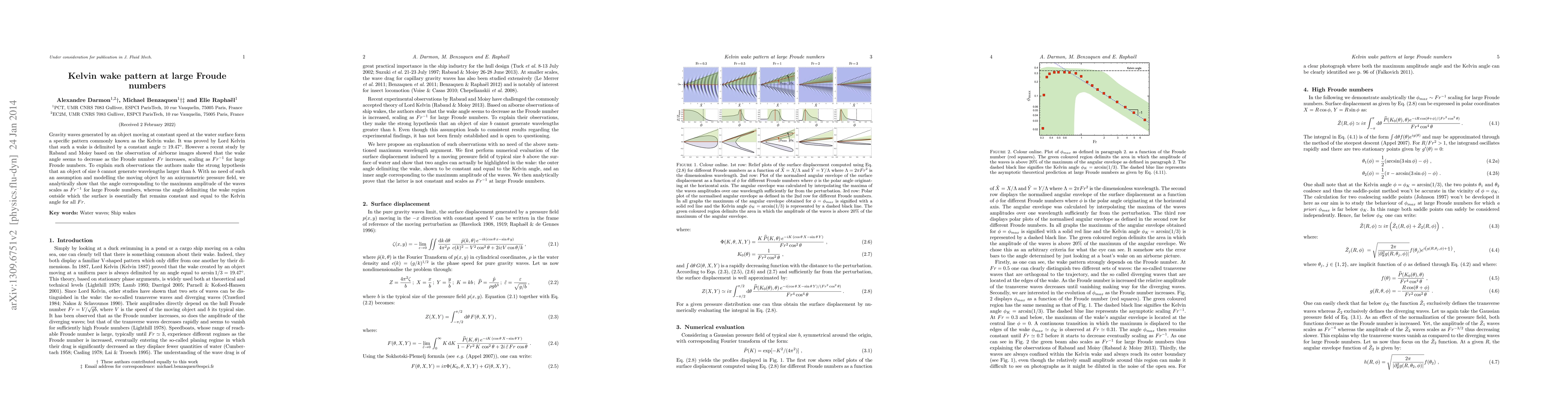 Researchers found that the angle of a Kelvin wake pattern decreases with increasing Froude numbers, scaling as Fr^{-1} for large Froude numbers, but the angle delimiting the wake region remains constant at approximately 19.47 degrees.