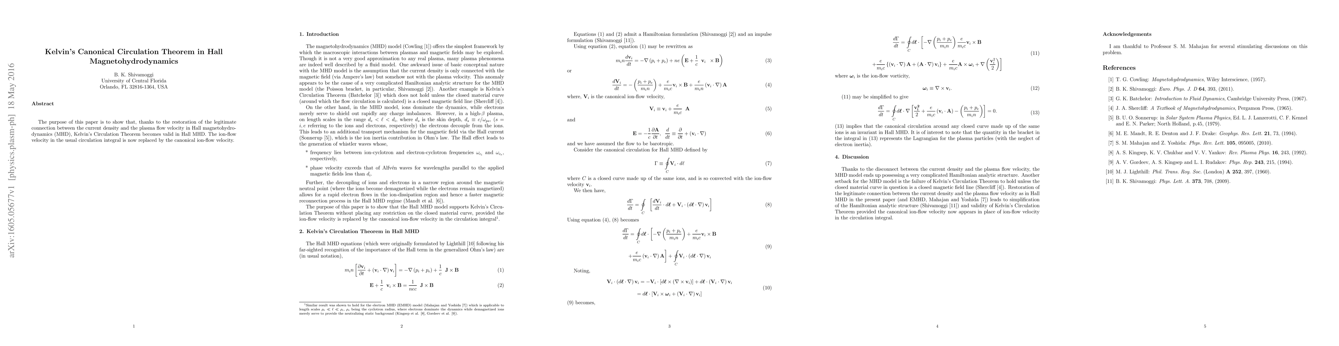 Kelvin's Circulation Theorem is shown to hold true in Hall magnetohydrodynamics by establishing a correct link between current density and plasma flow velocity, replacing the ion-flow velocity in circulation integrals with the canonical ion-flow velocity. This restoration validates the theorem in this context.
