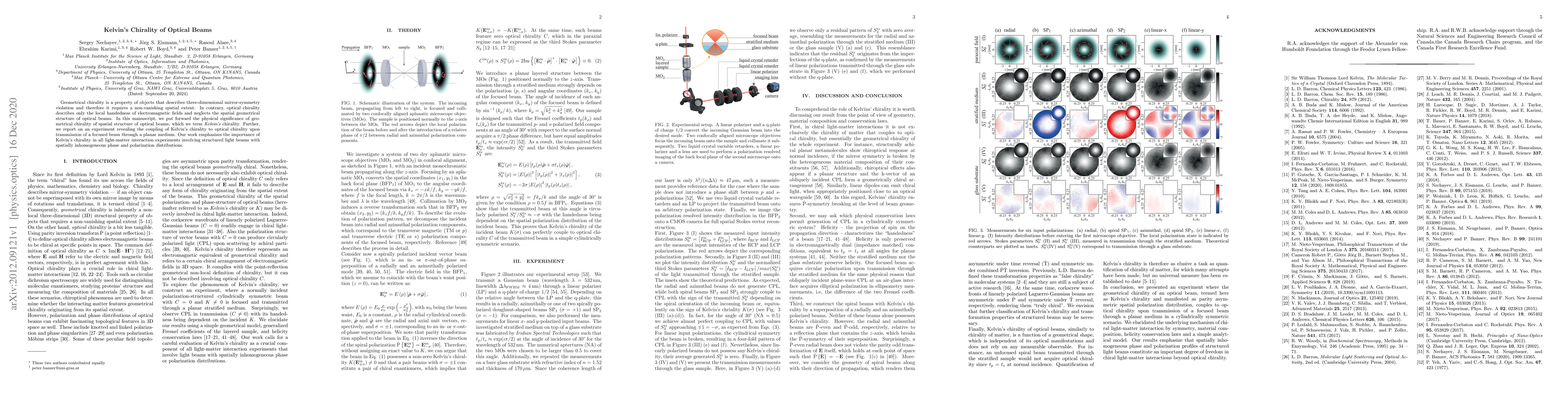 Geometrical chirality is a property of objects that describes three-dimensional mirror-symmetry violation and therefore it requires a non-vanishing spatial extent. In contrary, optical chirality describes only the local handedness of electromagnetic fields and neglects the spatial geometrical structure of optical beams. In this manuscript, we put forward the physical significance of geometrical chirality of spatial structure of optical beams, which we term "Kelvin's chirality". Further, we report on an experiment revealing the coupling of Kelvin's chirality to optical chirality upon transmission of a focused beam through a planar medium. Our work emphasizes the importance of Kelvin's chirality in all light-matter interaction experiments involving structured light beams with spatially inhomogeneous phase and polarization distributions.