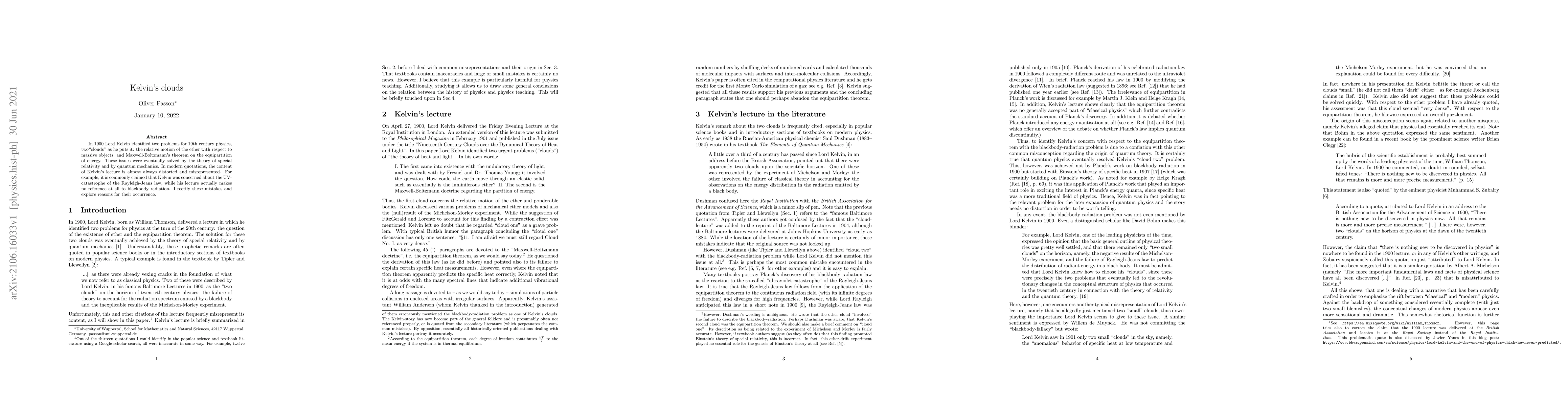 This paper rectifies common misrepresentations of Lord Kelvin's 1900 lecture on two 'clouds' in physics, which were eventually solved by special relativity and quantum mechanics. It explores reasons for these distortions, providing an accurate account of Kelvin's actual concerns.