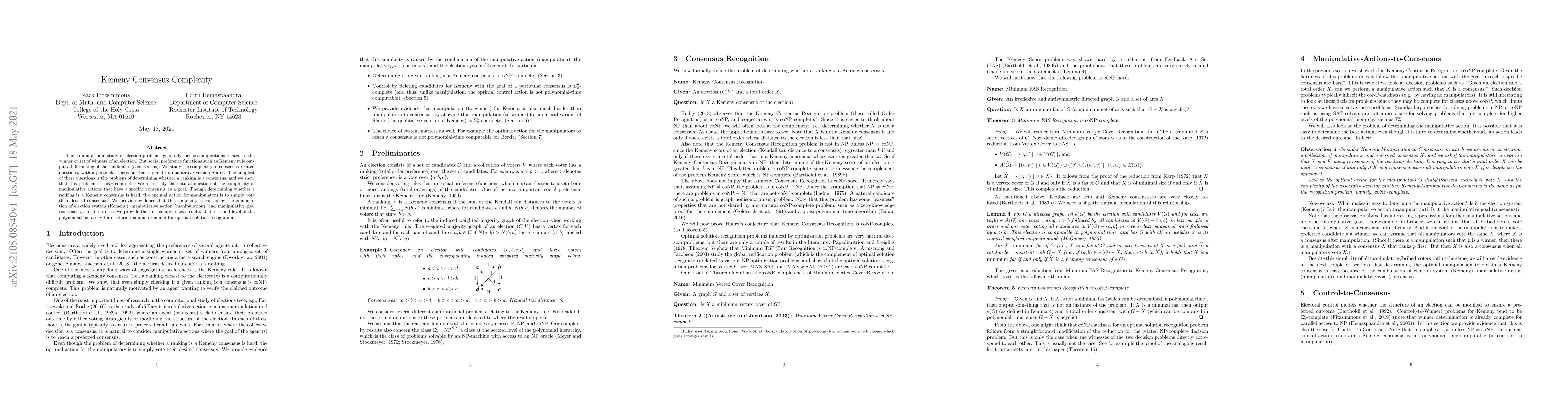 This paper investigates the computational complexity of consensus-related election problems, specifically focusing on the Kemeny rule. It demonstrates that determining whether a ranking is a Kemeny consensus is coNP-complete, while the optimal manipulative strategy for achieving a desired consensus is surprisingly simple. The study also provides completeness results for electoral manipulation and optimal solution recognition.