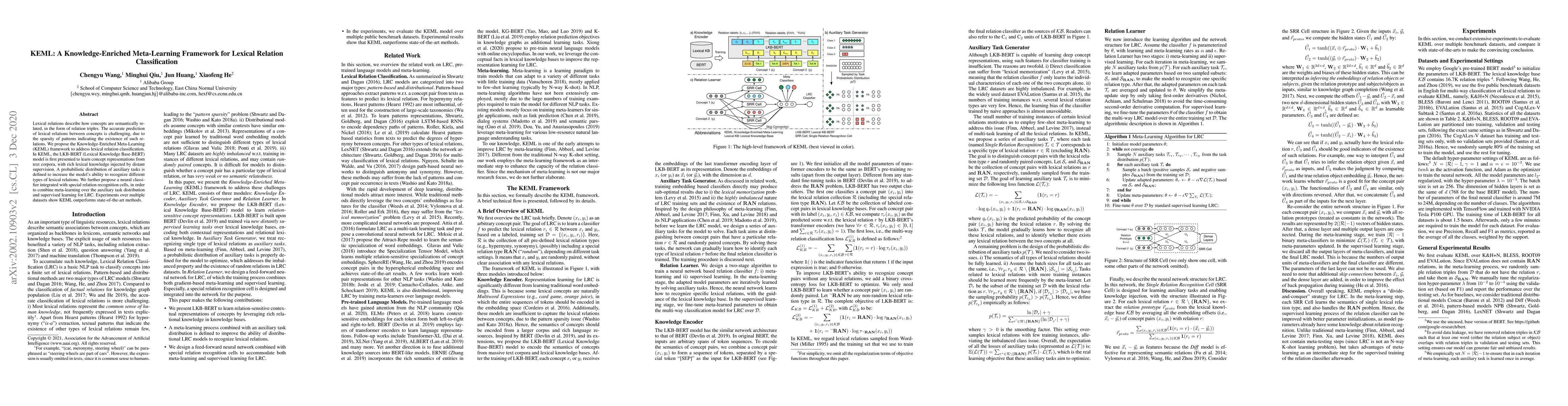 The KEML framework improves lexical relation classification by combining concept representations learned from text corpora with a meta-learning process over auxiliary tasks, outperforming state-of-the-art methods.