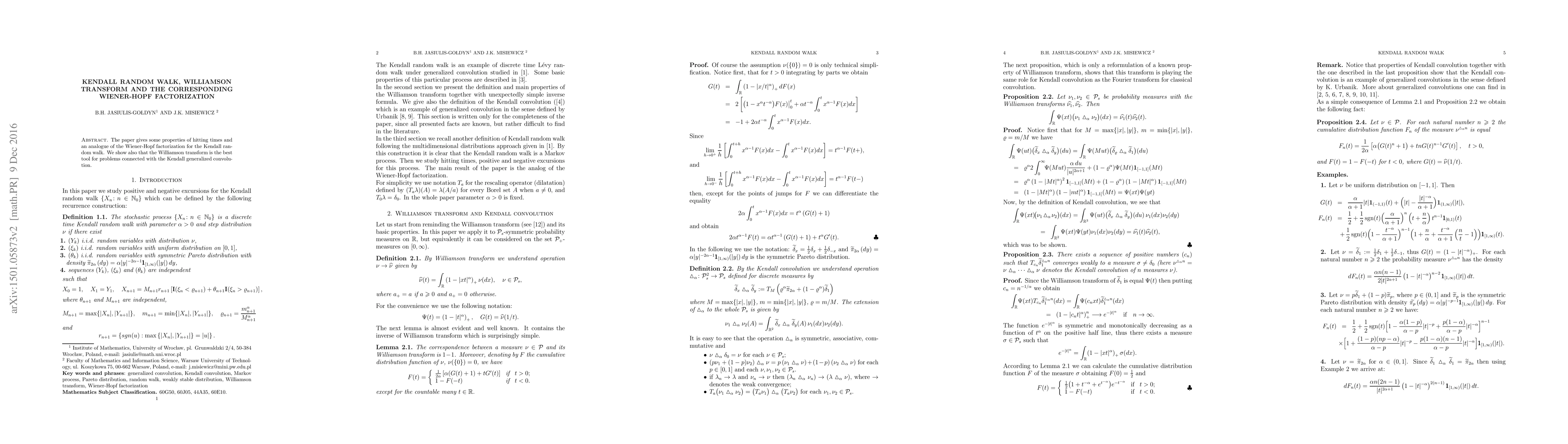 Summary: This paper explores properties of hitting times for the Kendall random walk and presents an analogue of the Wiener-Hopf factorization. It demonstrates that the Williamson transform is the optimal method for addressing problems involving Kendall's generalized convolution.