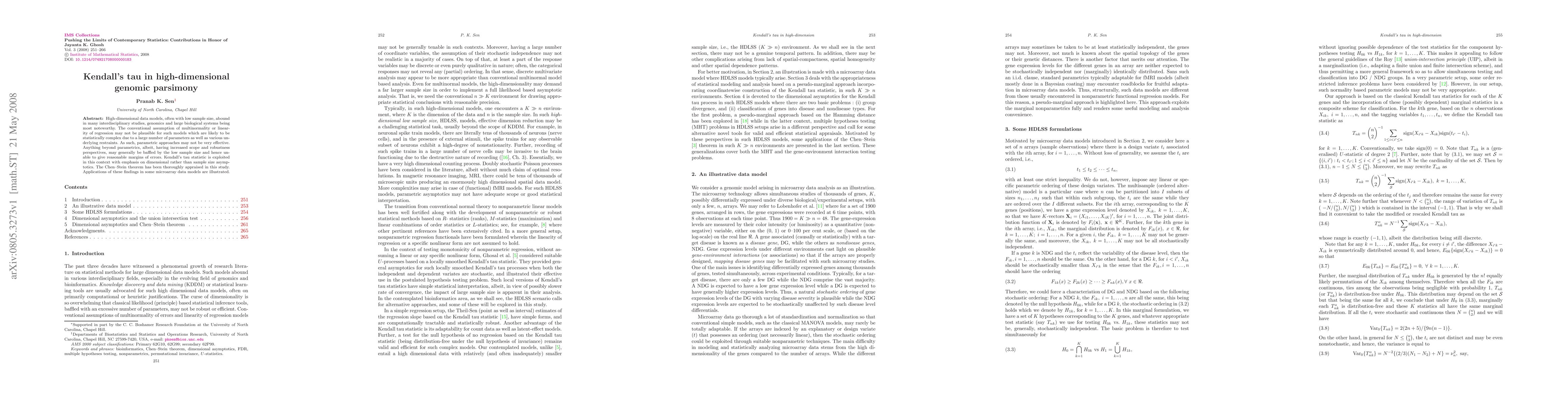 High-dimensional data models, often with low sample size, abound in many interdisciplinary studies, genomics and large biological systems being most noteworthy. The conventional assumption of multinormality or linearity of regression may not be plausible for such models which are likely to be statistically complex due to a large number of parameters as well as various underlying restraints. As such, parametric approaches may not be very effective. Anything beyond parametrics, albeit, having increased scope and robustness perspectives, may generally be baffled by the low sample size and hence unable to give reasonable margins of errors. Kendall's tau statistic is exploited in this context with emphasis on dimensional rather than sample size asymptotics. The Chen--Stein theorem has been thoroughly appraised in this study. Applications of these findings in some microarray data models are illustrated.
