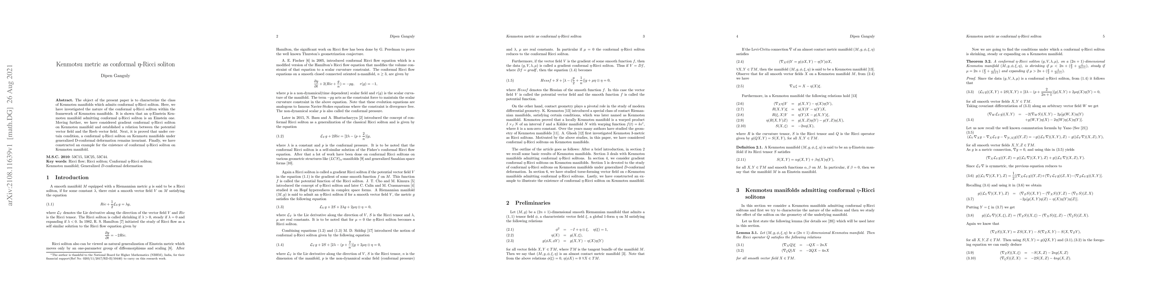 The object of the present paper is to characterize the class of Kenmotsu manifolds which admits conformal $\eta$-Ricci soliton. Here, we have investigated the nature of the conformal $\eta$-Ricci soliton within the framework of Kenmotsu manifolds. It is shown that an $\eta$-Einstein Kenmotsu manifold admitting conformal $\eta$-Ricci soliton is an Einstein one. Moving further, we have considered gradient conformal $\eta$-Ricci soliton on Kenmotsu manifold and established a relation between the potential vector field and the Reeb vector field. Next, it is proved that under certain condition, a conformal $\eta$-Ricci soliton on Kenmotu manifolds under generalized D-conformal deformation remains invariant. Finally, we have constructed an example for the existence of conformal $\eta$-Ricci soliton on Kenmotsu manifold.
