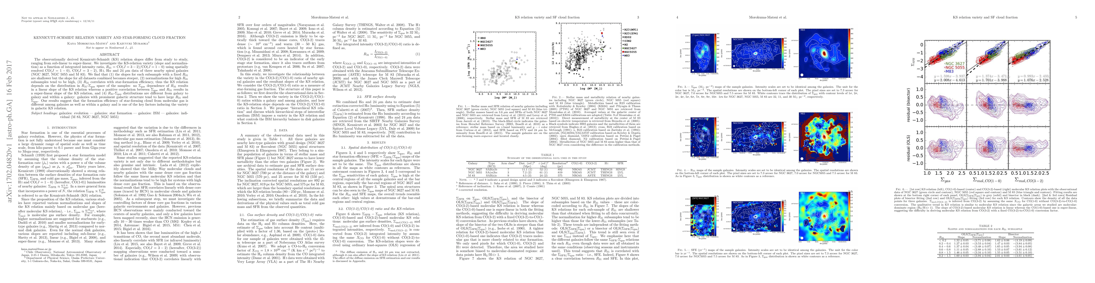This paper investigates the variability in the Kennicutt-Schmidt (KS) star-formation relation across three nearby spiral galaxies, finding that the relation's slope and normalization depend on the integrated intensity ratio R31 of CO lines, which correlates with star-formation efficiency. The study concludes that differences in star-forming cloud formation efficiency among and within galaxies are key factors influencing the KS relation's variability.