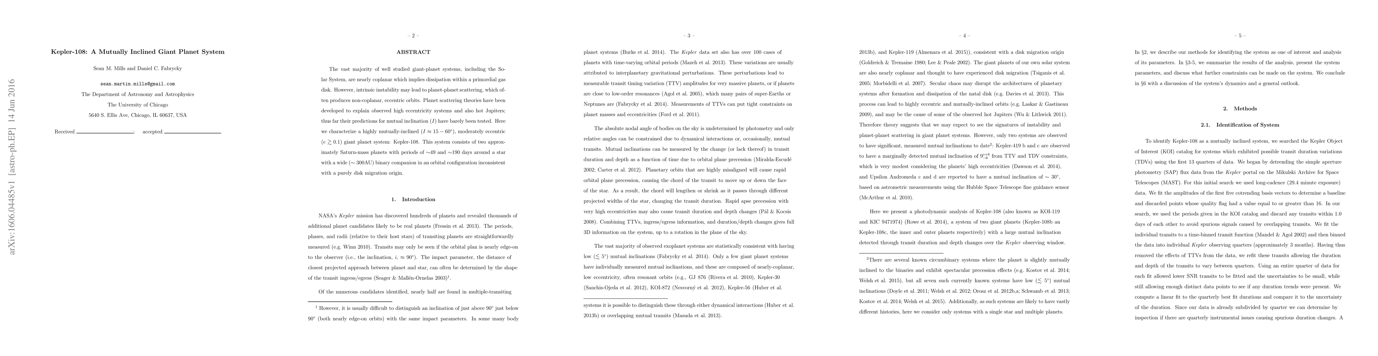 This paper presents Kepler-108, a giant planet system with two Saturn-mass planets exhibiting high mutual inclination (~15-60 degrees) and eccentric orbits, challenging theories of planetary migration and suggesting evidence of planet-planet scattering.