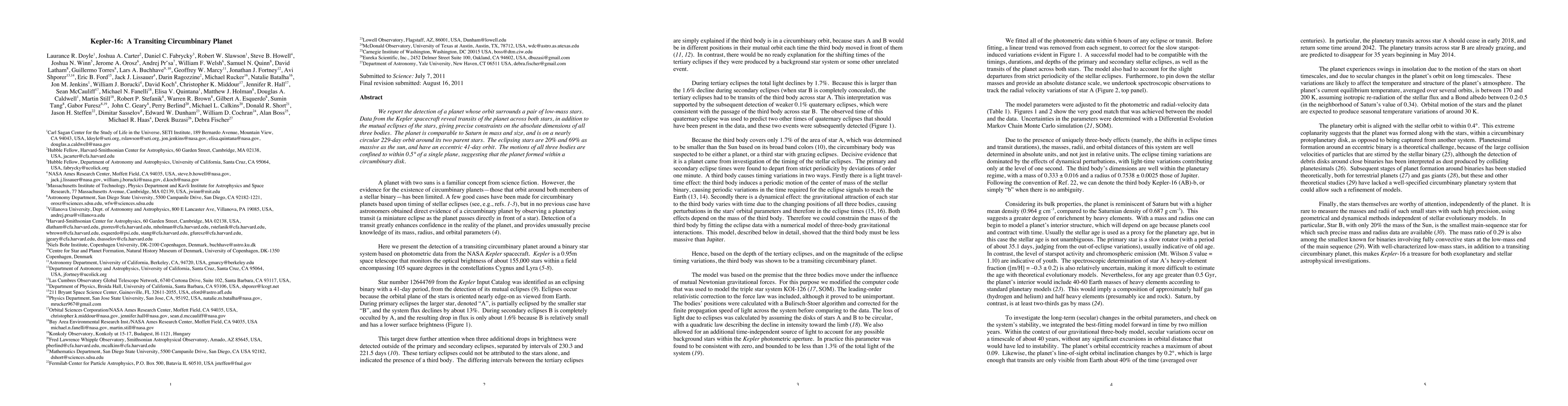 The Kepler spacecraft detected a circumbinary planet, Kepler-16, orbiting a pair of low-mass stars, with precise measurements of the planet's size and orbit, and the stars' mutual eclipses. The planet is similar to Saturn and orbits the binary system in a nearly circular 229-day orbit.