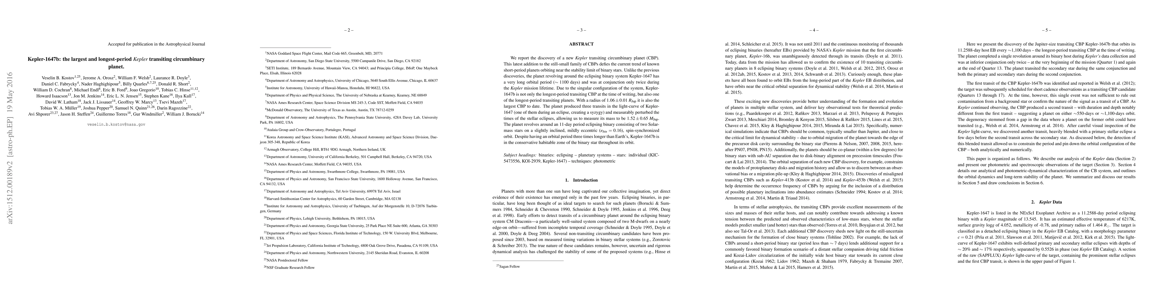 Kepler-1647b is a newly discovered circumbinary planet with an exceptionally long orbital period of ~1100 days, making it the largest and longest-period transiting circumbinary planet known to date. It orbits an eclipsing binary system and resides within the conservative habitable zone.