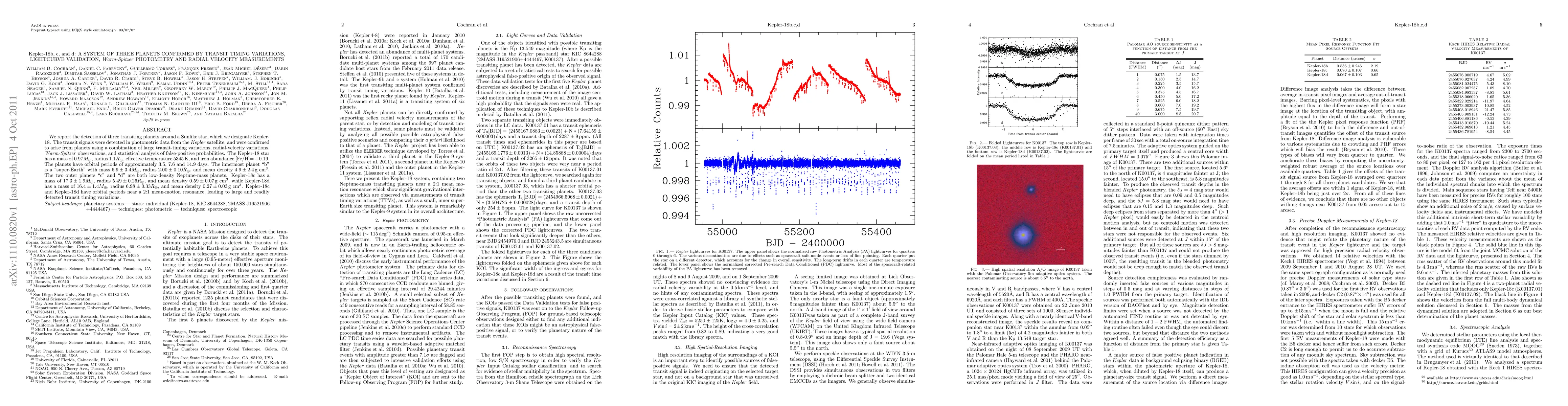 This paper confirms the existence of three transiting planets around the Sun-like star Kepler-18, using data from the Kepler satellite, transit timing variations, and radial-velocity measurements. The planets, Kepler-18b, c, and d, exhibit orbital periods of 3.5, 7.6, and 14.9 days respectively, with b being a super-Earth and c and d being low-density Neptune-mass planets in a 2:1 orbital resonance.