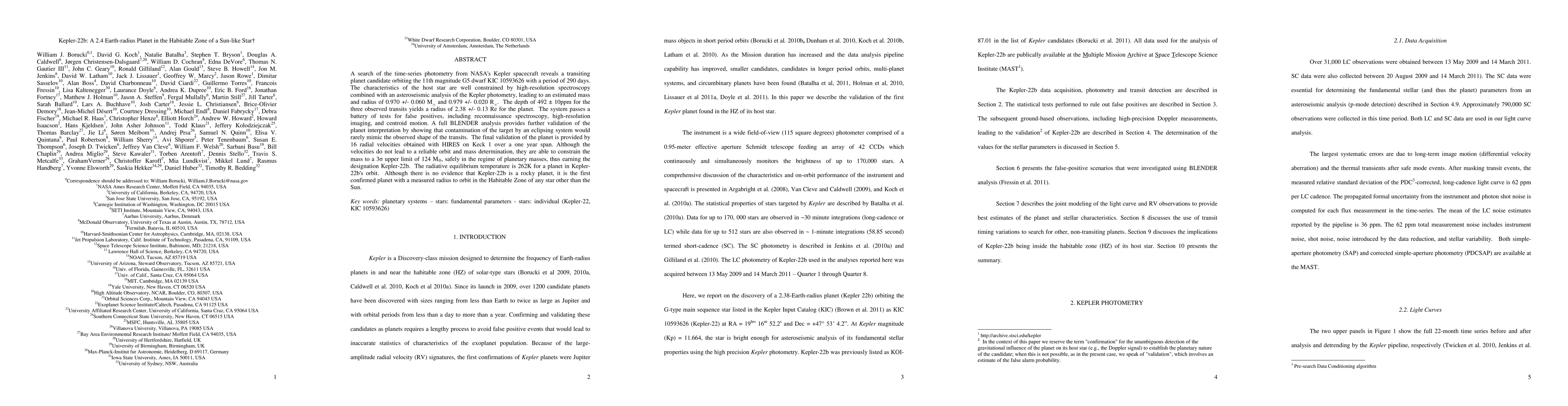 Kepler-22b is a confirmed exoplanet with a radius of 2.38 REarth, orbiting within the habitable zone of a Sun-like star, KIC 10593626, making it the first such planet discovered outside our solar system. The planet's mass is constrained to be within planetary limits, though its exact nature remains uncertain.