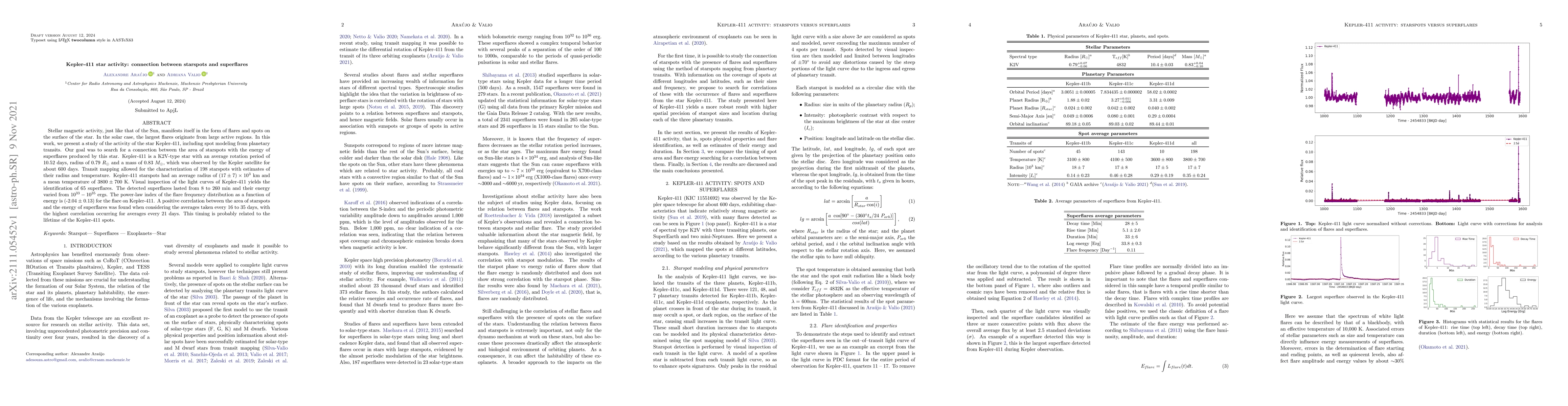 This study investigates the magnetic activity of the K2V-type star Kepler-411, identifying 198 starspots and 65 superflares. A positive correlation was found between the area of starspots and the energy of superflares, with the strongest correlation occurring when averaging data every 21 days, likely tied to the spots' lifetime.
