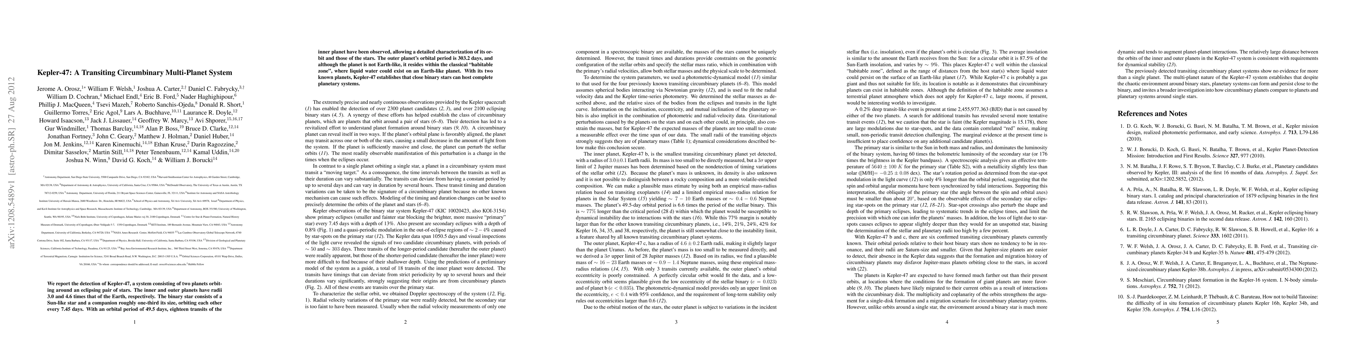 Kepler-47 is a circumbinary multi-planet system with two planets orbiting an eclipsing binary star system, demonstrating that complete planetary systems can exist around close binary stars. The planets have radii of 3.0 and 4.6 times that of Earth, with the outer planet residing in the habitable zone.