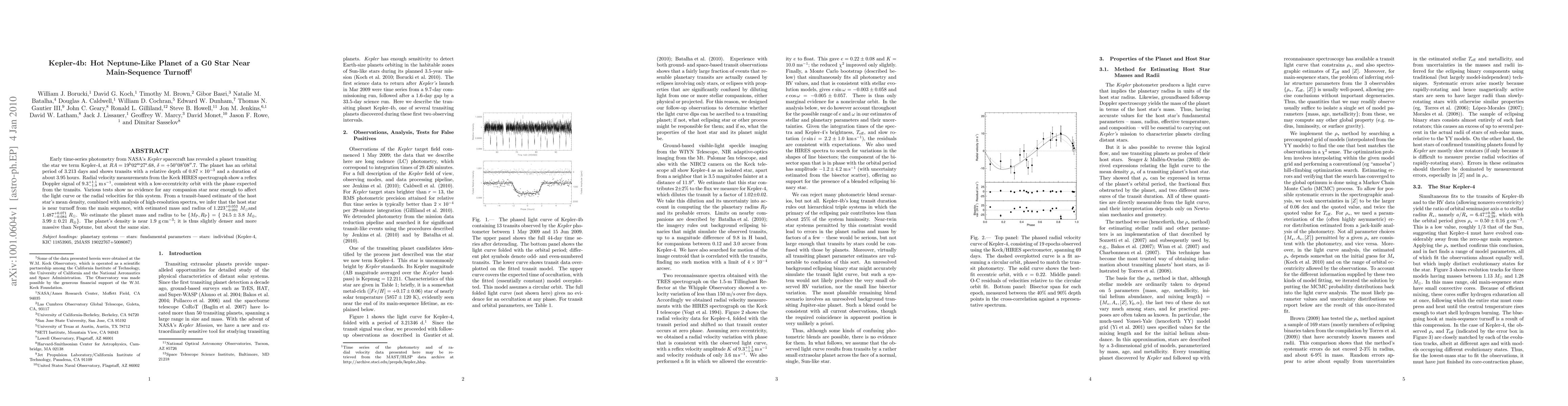 Kepler-4b is a hot Neptune-like planet orbiting a G0 star near its main-sequence turnoff, with an orbital period of 3.213 days and a radius of 3.99 Earth radii. The planet is slightly denser than Neptune, with a mass of 24.5 Earth masses.