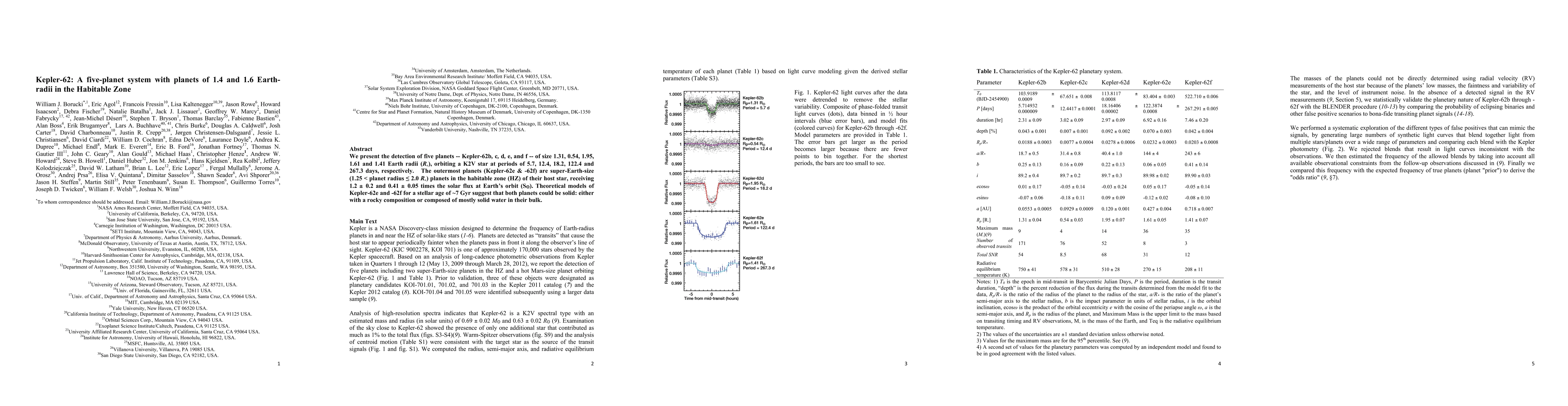 This paper reports the discovery of five planets orbiting Kepler-62, with Kepler-62e and f being super-Earths in the habitable zone, potentially solid and composed of rock or water. These findings expand the search for potentially habitable worlds beyond our solar system.