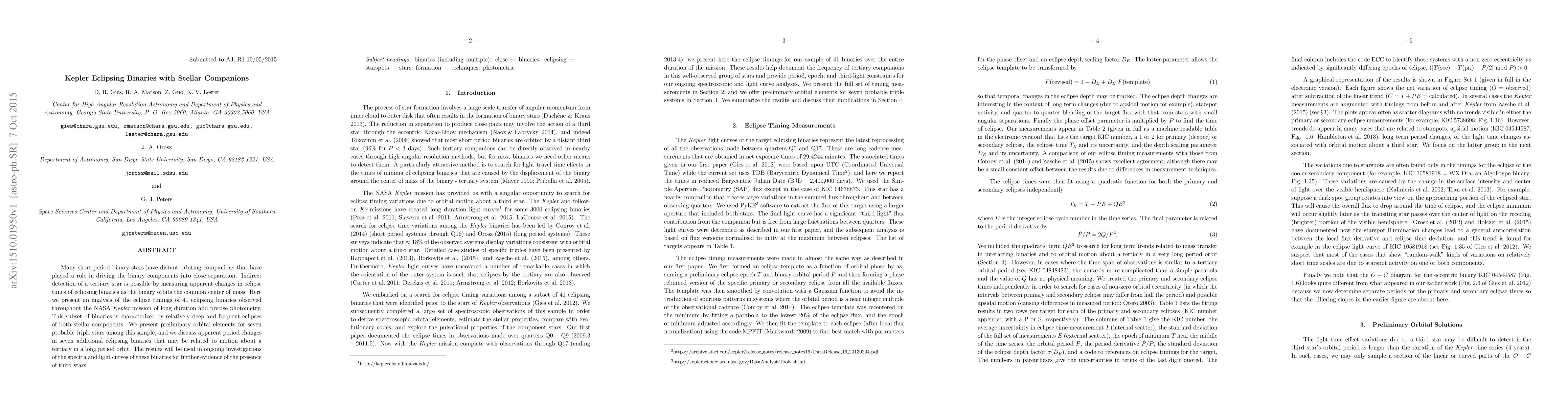 Many short-period binary stars have distant orbiting companions that have played a role in driving the binary components into close separation. Indirect detection of a tertiary star is possible by measuring apparent changes in eclipse times of eclipsing binaries as the binary orbits the common center of mass. Here we present an analysis of the eclipse timings of 41 eclipsing binaries observed throughout the NASA Kepler mission of long duration and precise photometry. This subset of binaries is characterized by relatively deep and frequent eclipses of both stellar components. We present preliminary orbital elements for seven probable triple stars among this sample, and we discuss apparent period changes in seven additional eclipsing binaries that may be related to motion about a tertiary in a long period orbit. The results will be used in ongoing investigations of the spectra and light curves of these binaries for further evidence of the presence of third stars.