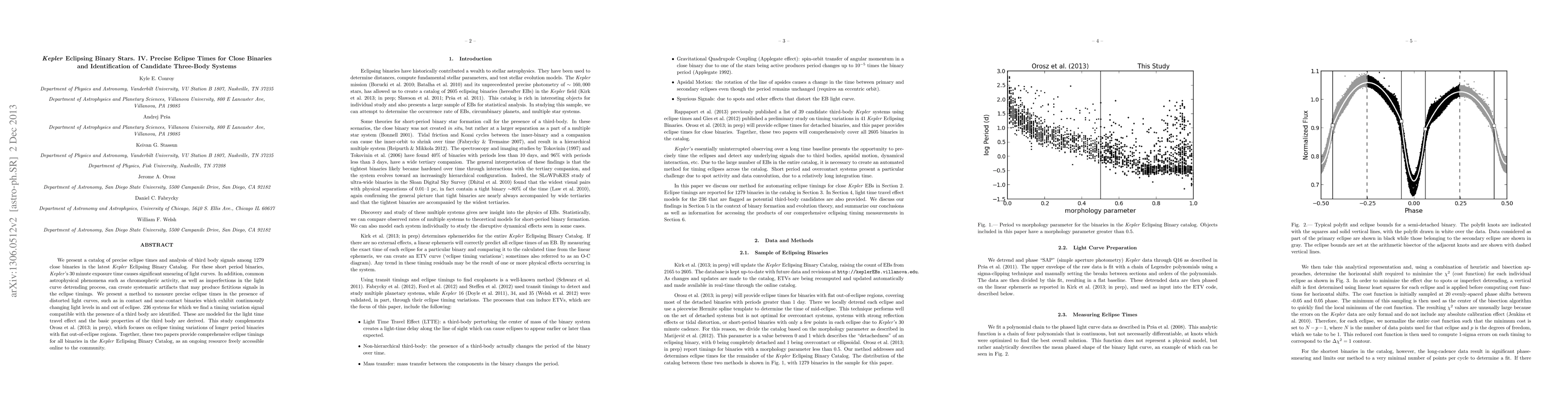 This paper catalogs precise eclipse times for 1279 close binaries observed by Kepler, addressing systematic artifacts and presenting methods to measure eclipse times in distorted light curves. It identifies 236 candidate three-body systems based on timing variations, complementing the study of longer period binaries.