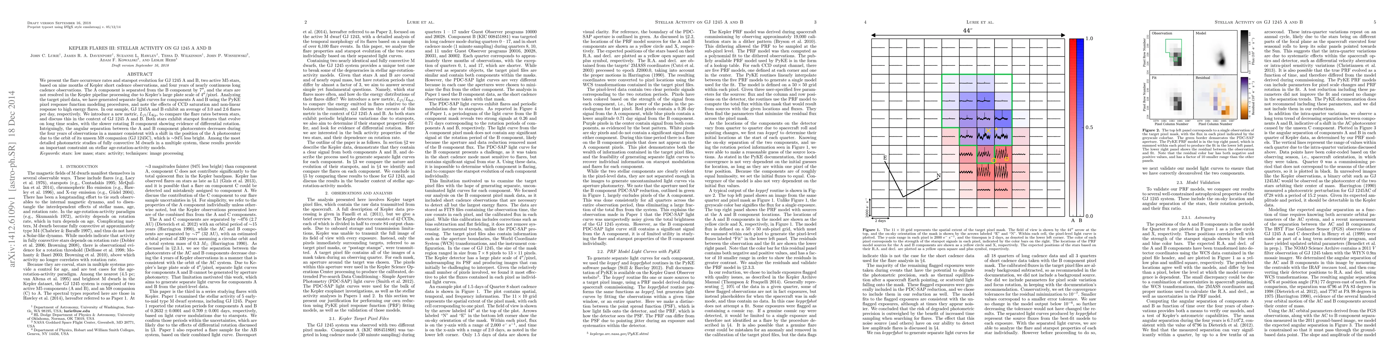 We present the flare occurrence rates and starspot evolution for GJ 1245 A and B, two active M5 stars, based on nine months of Kepler short cadence observations, and four years of nearly continuous long cadence observations. The A component is separated from the B component by 7 arcseconds, and the stars are not resolved in the Kepler pipeline processing due to Kepler's large plate scale of 4 arcseconds/pixel. Analyzing the target pixel data, we have generated separate light curves for components A and B using the PyKE pixel response function modeling procedures, and note the effects of CCD saturation and non-linear response to high energy flares. In our sample, GJ 1245A and B exhibit an average of 3.0 and 2.6 flares per day, respectively. We introduce a new metric, $L_{fl}/L_{\mathrm{Kp}}$, to compare the flare rates between stars, and discuss this in the context of GJ 1245 A and B. Both stars exhibit starspot features that evolve on long time scales, with the slower rotating B component showing evidence of differential rotation. Intriguingly, the angular separation between the A and B component photocenters decreases during the four years of observations in a manner consistent with a shift in the position of the A photocenter due to the orbit of its unseen M8 companion (GJ 1245C), which is $\sim$94% less bright. Among the most detailed photometric studies of fully convective M dwarfs in a multiple system, these results provide an important constraint on stellar age-rotation-activity models.