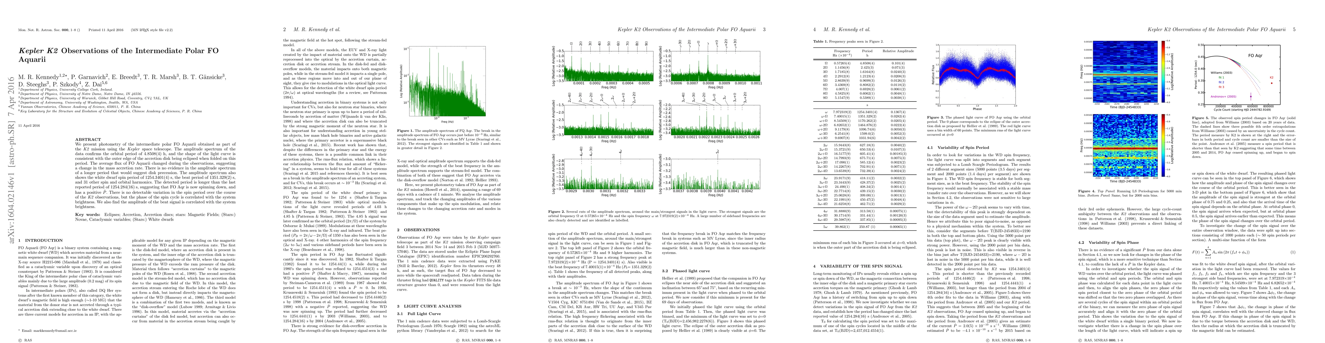 New observations of FO Aquarii using the Kepler space telescope show that its white dwarf spin period is longer than previously reported, with a possible increase in spin-down rate. The system's brightness is correlated with its spin cycle.