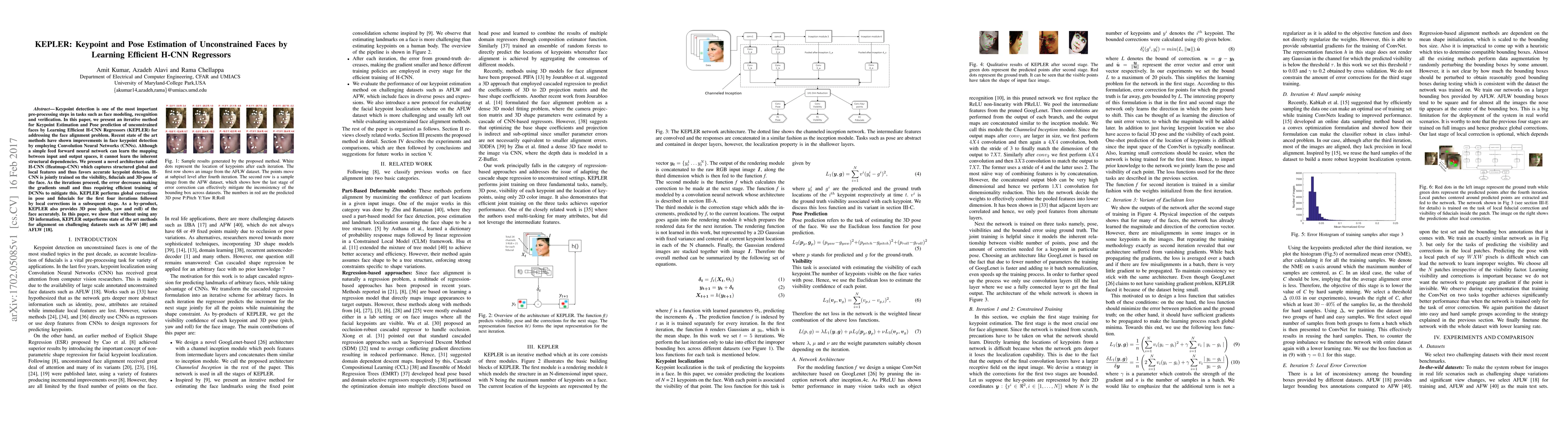 KEPLER introduces an iterative method for keypoint estimation and pose prediction of unconstrained faces using efficient H-CNN regressors, outperforming state-of-the-art methods on challenging datasets without relying on 3D information. The H-CNN architecture captures structured global and local features, enabling accurate keypoint detection and 3D pose estimation.