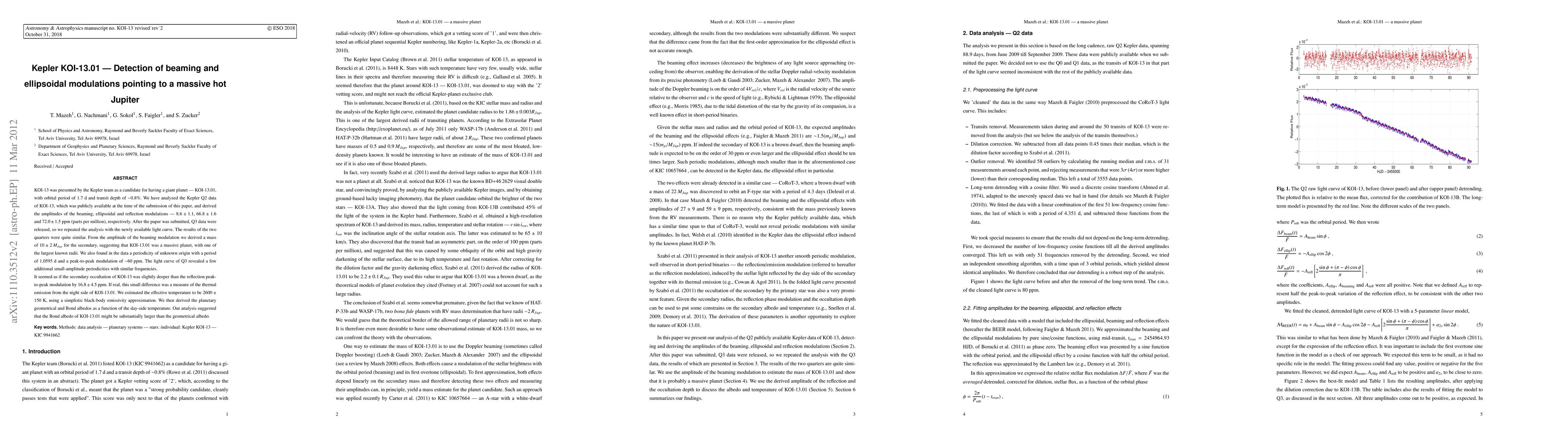 This research paper analyzes Kepler data to detect beaming and ellipsoidal modulations in KOI-13.01, identifying it as a massive hot Jupiter with a mass of 10 +/- 2 M_Jup and a large radius. The study also finds a potential thermal emission difference and estimates an effective temperature of 2600 +/- 150 K.