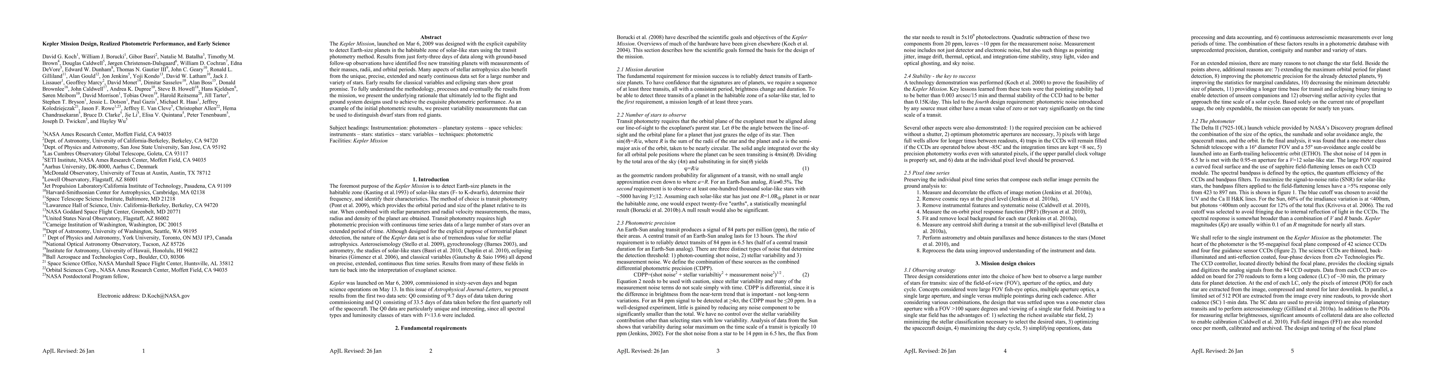 The Kepler Mission, launched on Mar 6, 2009 was designed with the explicit capability to detect Earth-size planets in the habitable zone of solar-like stars using the transit photometry method. Results from just forty-three days of data along with ground-based follow-up observations have identified five new transiting planets with measurements of their masses, radii, and orbital periods. Many aspects of stellar astrophysics also benefit from the unique, precise, extended and nearly continuous data set for a large number and variety of stars. Early results for classical variables and eclipsing stars show great promise. To fully understand the methodology, processes and eventually the results from the mission, we present the underlying rationale that ultimately led to the flight and ground system designs used to achieve the exquisite photometric performance. As an example of the initial photometric results, we present variability measurements that can be used to distinguish dwarf stars from red giants.