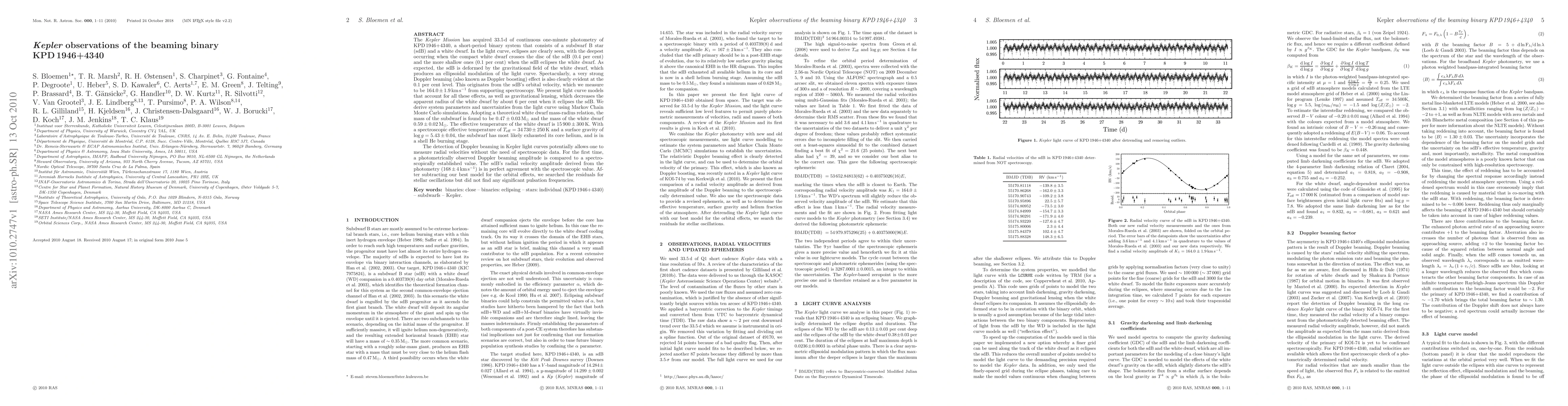 The Kepler Mission observed KPD 1946+4340, a binary system with an sdB and a white dwarf, revealing distinct eclipses and ellipsoidal modulation. Spectacularly, it identified a strong Doppler beaming effect at a 0.1% level due to the sdB's orbital velocity of 164.0±1.9 km/s. Using light curve models and MCMC simulations, the researchers derived system parameters: sdB mass 0.47±0.03 Msun, white dwarf mass 0.59±0.02 Msun, and white dwarf temperature 15 900±300K. The sdB's temperature and gravity confirmed its shell He burning stage. Remarkably, the photometrically derived radial velocity amplitude (168±4 km/s) matched the spectroscopic value, demonstrating the potential of photometry for radial velocity measurement without spectroscopy.