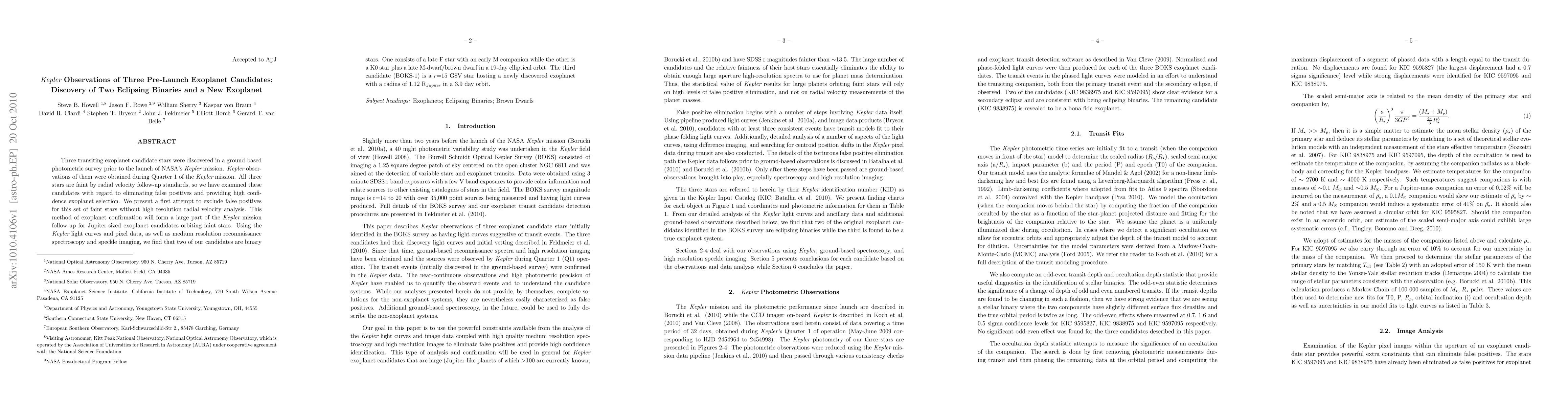 This paper reports on the {\it Kepler} observations of three pre-launch exoplanet candidates, revealing two eclipsing binary star systems and confirming a new exoplanet, BOKS-1, with a radius of 1.12 R$_{Jupiter}$ orbiting a G8V star in a 3.9-day orbit. The study employs {\it Kepler} light curves and spectroscopy to identify false positives.