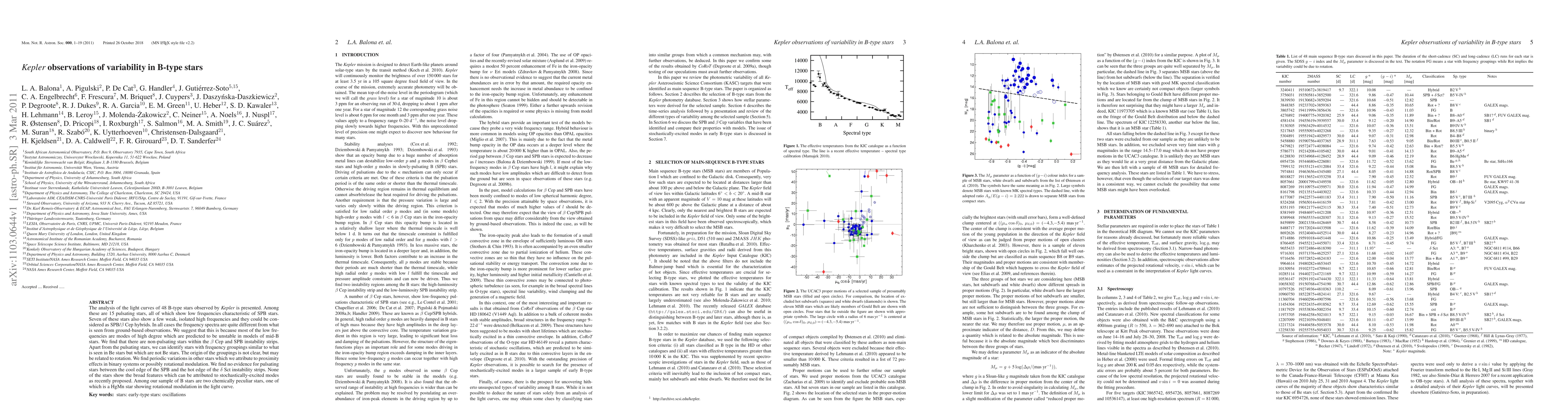 The analysis of the light curves of 48 B-type stars observed by Kepler is presented. Among these are 15 pulsating stars, all of which show low frequencies characteristic of SPB stars. Seven of these stars also show a few weak, isolated high frequencies and they could be considered as SPB/beta Cep hybrids. In all cases the frequency spectra are quite different from what is seen from ground-based observations. We suggest that this is because most of the low frequencies are modes of high degree which are predicted to be unstable in models of mid-B stars. We find that there are non-pulsating stars within the beta Cep and SPB instability strips. Apart from the pulsating stars, we can identify stars with frequency groupings similar to what is seen in Be stars but which are not Be stars. The origin of the groupings is not clear, but may be related to rotation. We find periodic variations in other stars which we attribute to proximity effects in binary systems or possibly rotational modulation. We find no evidence for pulsating stars between the cool edge of the SPB and the hot edge of the delta Sct instability strips. None of the stars show the broad features which can be attributed to stochastically-excited modes as recently proposed. Among our sample of B stars are two chemically peculiar stars, one of which is a HgMn star showing rotational modulation in the light curve.
