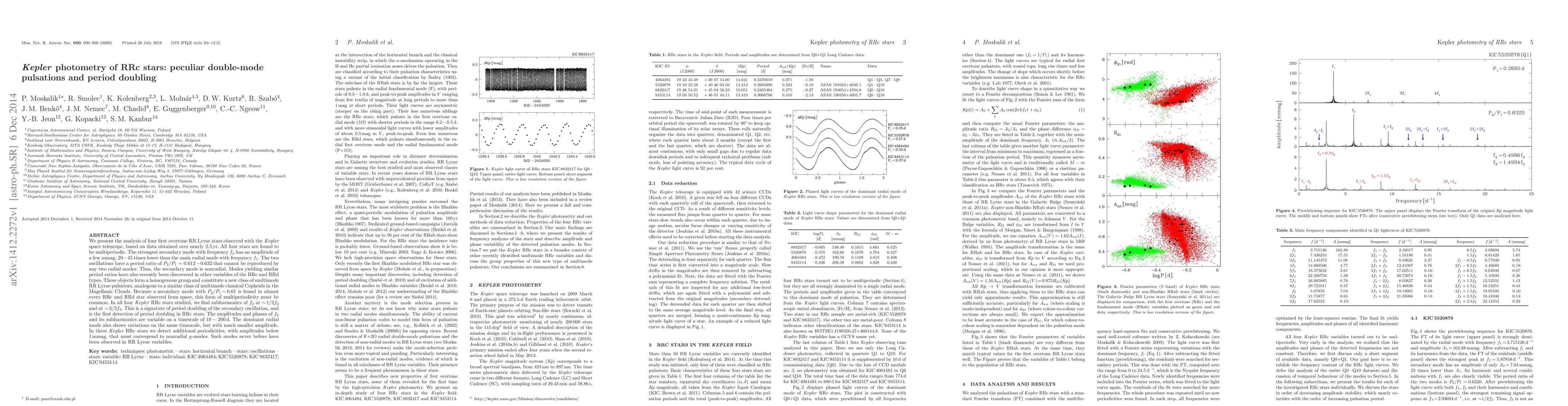 We present the analysis of four first overtone RR Lyrae stars observed with the Kepler space telescope, based on data obtained over nearly 2.5yr. All four stars are found to be multiperiodic. The strongest secondary mode with frequency f_2 has an amplitude of a few mmag, 20 - 45 times lower than the main radial mode with frequency f_1. The two oscillations have a period ratio of P_2/P_1 = 0.612 - 0.632 that cannot be reproduced by any two radial modes. Thus, the secondary mode is nonradial. Modes yielding similar period ratios have also recently been discovered in other variables of the RRc and RRd types. These objects form a homogenous group and constitute a new class of multimode RR Lyrae pulsators, analogous to a similar class of multimode classical Cepheids in the Magellanic Clouds. Because a secondary mode with P_2/P_1 ~ 0.61 is found in almost every RRc and RRd star observed from space, this form of multiperiodicity must be common. In all four Kepler RRc stars studied, we find subharmonics of f_2 at ~1/2 f_2 and at ~3/2 f_2. This is a signature of period doubling of the secondary oscillation, and is the first detection of period doubling in RRc stars. The amplitudes and phases of f_2 and its subharmonics are variable on a timescale of 10 - 200d. The dominant radial mode also shows variations on the same timescale, but with much smaller amplitude. In three Kepler RRc stars we detect additional periodicities, with amplitudes below 1mmag, that must correspond to nonradial g-modes. Such modes never before have been observed in RR Lyrae variables.