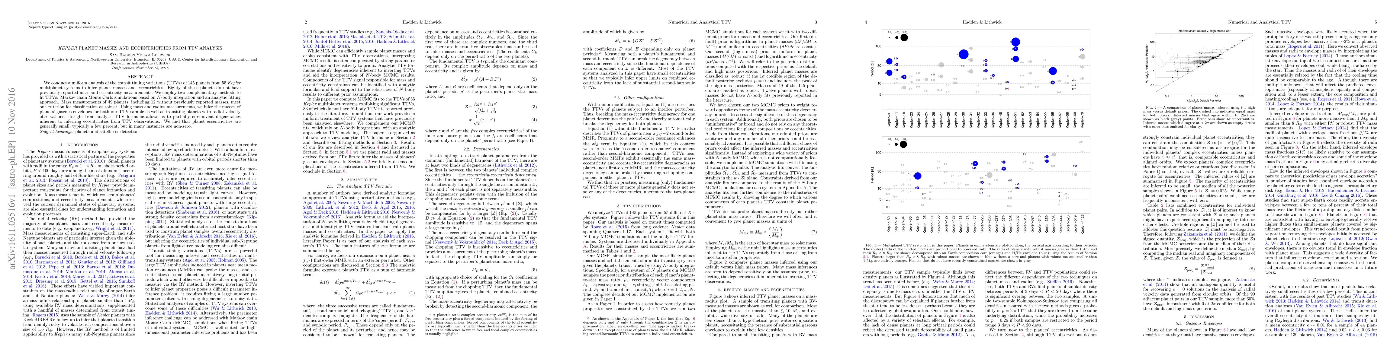 We conduct a uniform analysis of the transit timing variations (TTVs) of 145 planets from 55 Kepler multiplanet systems to infer planet masses and eccentricities. Eighty of these planets do not have previously reported mass and eccentricity measurements. We employ two complementary methods to fit TTVs: Markov chain Monte Carlo simulations based on N-body integration and an analytic fitting approach. Mass measurements of 49 planets, including 12 without previously reported masses, meet our criterion for classification as robust. Using mass and radius measurements, we infer the masses of planets' gaseous envelopes for both our TTV sample as well as transiting planets with radial velocity observations. Insight from analytic TTV formulae allows us to partially circumvent degeneracies inherent to inferring eccentricities from TTV observations. We find that planet eccentricities are generally small, typically a few percent, but in many instances are non-zero.