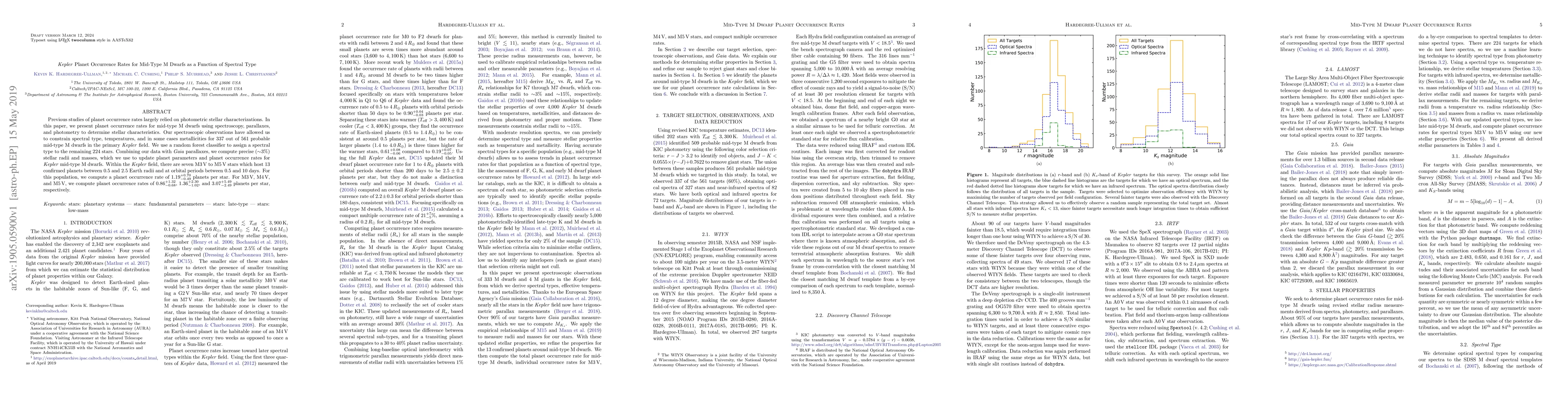 Previous studies of planet occurrence rates largely relied on photometric stellar characterizations. In this paper, we present planet occurrence rates for mid-type M dwarfs using spectroscopy, parallaxes, and photometry to determine stellar characteristics. Our spectroscopic observations have allowed us to constrain spectral type, temperatures, and in some cases metallicities for 337 out of 561 probable mid-type M dwarfs in the primary Kepler field. We use a random forest classifier to assign a spectral type to the remaining 224 stars. Combining our data with Gaia parallaxes, we compute precise ($\sim$3%) stellar radii and masses, which we use to update planet parameters and planet occurrence rates for Kepler mid-type M dwarfs. Within the Kepler field, there are seven M3 V to M5 V stars which host 13 confirmed planets between 0.5 and 2.5 Earth radii and at orbital periods between 0.5 and 10 days. For this population, we compute a planet occurrence rate of $1.19^{+0.70}_{-0.49}$ planets per star. For M3 V, M4 V, and M5 V, we compute planet occurrence rates of $0.86^{+1.32}_{-0.68}$, $1.36^{+2.30}_{-1.02}$, and $3.07^{+5.49}_{-2.49}$ planets per star, respectively.