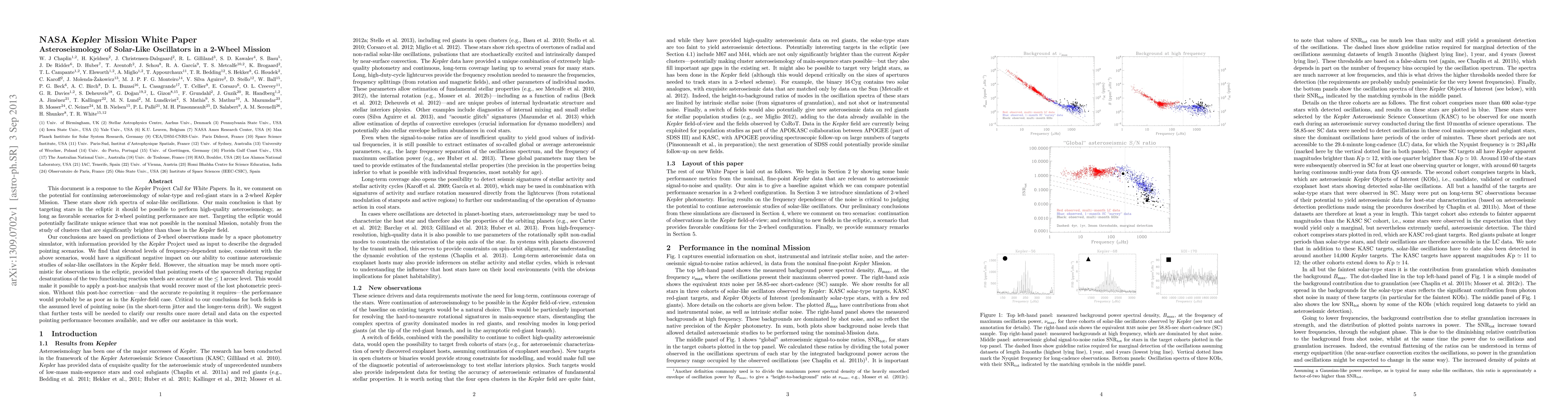 The paper discusses the potential for continuing asteroseismology of solar-type and red-giant stars in a 2-wheel Kepler Mission, suggesting that targeting stars in the ecliptic can enable high-quality observations if pointing resets are accurate. Elevated frequency-dependent noise could hinder studies in the Kepler field, but ecliptic observations may be more feasible with proper post-hoc analysis.