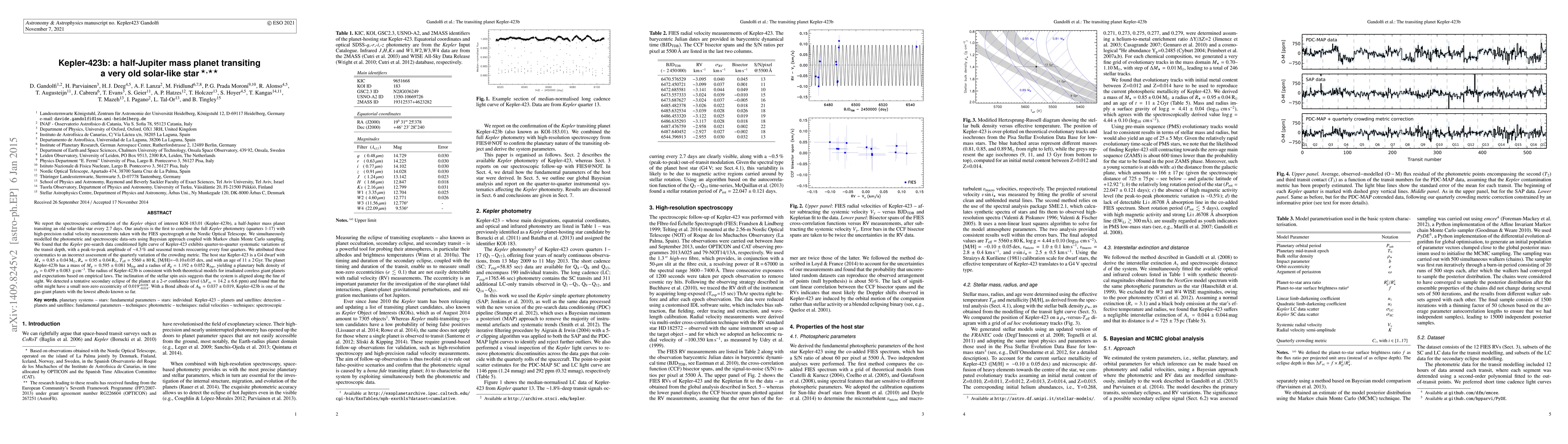 This study confirms the existence of Kepler-423b, a half-Jupiter mass planet orbiting an old solar-like star every 2.7 days. Using combined Kepler photometry and FIES spectrograph radial velocity data, researchers determined the planet's mass, radius, and bulk density, finding it to have a low albedo and a possible small orbital eccentricity.