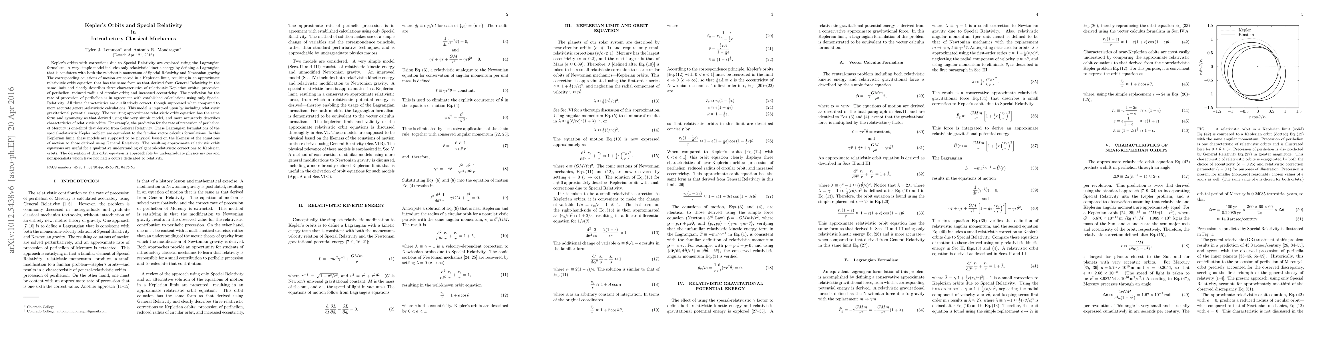 Researchers explored Kepler's orbits with corrections for Special Relativity using Lagrangian formalism, finding an approximate relativistic orbit equation that accurately describes three key characteristics of relativistic Keplerian orbits: precession of perihelion, reduced radius of circular orbit, and increased eccentricity.