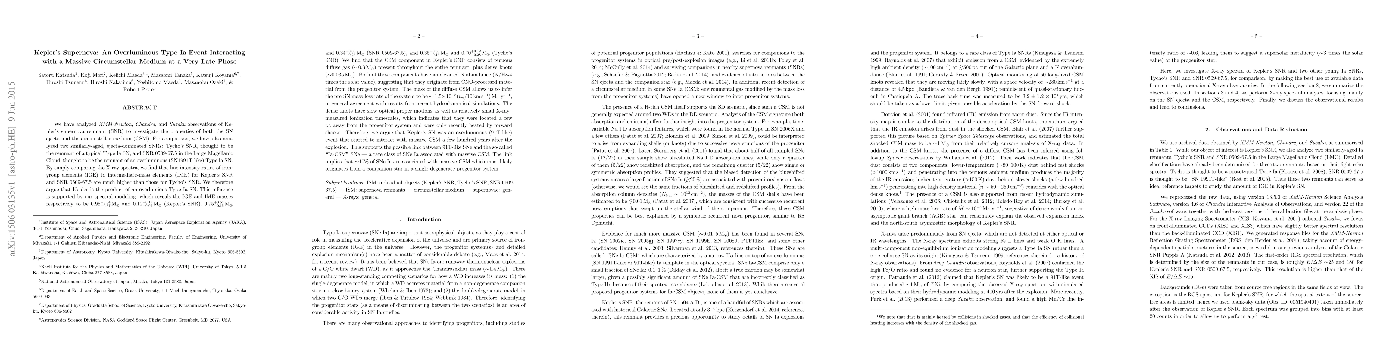 We have analyzed XMM-Newton, Chandra, and Suzaku observations of Kepler's supernova remnant (SNR) to investigate the properties of both the SN ejecta and the circumstellar medium (CSM). For comparison, we have also analyzed two similarly-aged, ejecta-dominated SNRs: Tycho's SNR, thought to be the remnant of a typical Type Ia SN, and SNR 0509-67.5 in the Large Magellanic Cloud, thought to be the remnant of an overluminous Type Ia SN. By simply comparing the X-ray spectra, we find that line intensity ratios of iron-group elements (IGE) to intermediate-mass elements (IME) for Kepler's SNR and SNR 0509-67.5 are much higher than those for Tycho's SNR. We therefore argue that Kepler is the product of an overluminous Type Ia SN. This inference is supported by our spectral modeling, which reveals the IGE and IME masses respectively to be ~0.95 M_sun and ~0.12 M_sun (Kepler's SNR), ~0.75 M_sun and ~0.34 M_sun (SNR 0509-67.5), and ~0.35 M_sun and ~0.70 M_sun (Tycho's SNR). We find that the CSM component in Kepler's SNR consists of tenuous diffuse gas (~0.3 M_sun) present throughout the entire remnant, plus dense knots (~0.035 M_sun). Both of these components have an elevated N abundance (N/H ~ 4 times the solar value), suggesting that they originate from CNO-processed material from the progenitor system. The mass of the diffuse CSM allows us to infer the pre-SN mass-loss rate to be ~1.5e-5 (V_w/10 km/s) M_sun/yr, in general agreement with results from recent hydrodynamical simulations. Since the dense knots have slow proper motions and relatively small ionization timescales, they were likely located a few pc away from the progenitor system. Therefore, we argue that Kepler's SN was an overluminous event that started to interact with massive CSM a few hundred years after the explosion. This supports the possible link between overluminous SNe and the so-called "Ia-CSM" SNe.