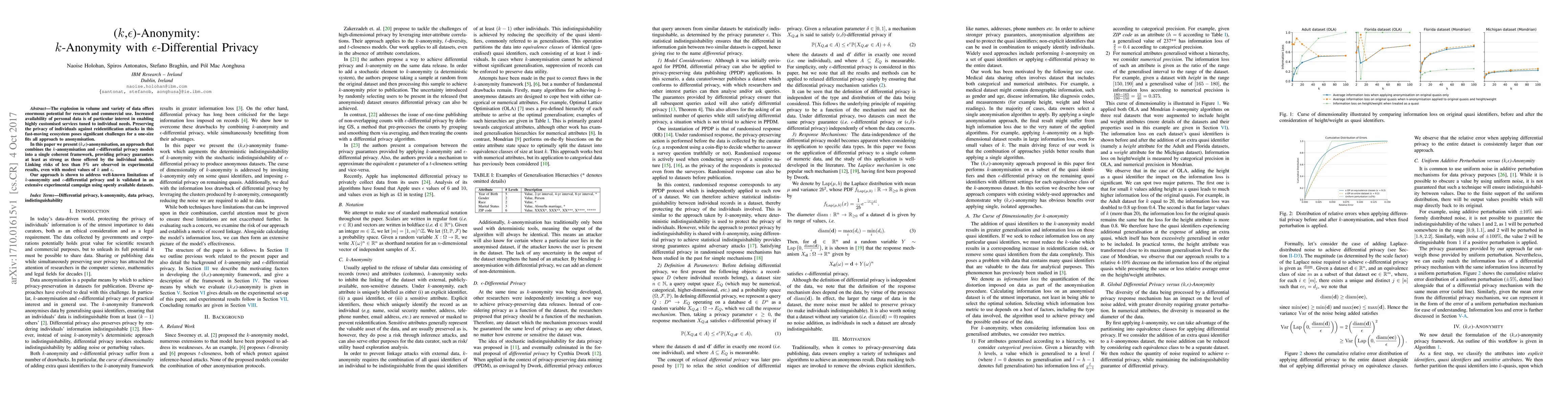 This paper introduces ($k$,$\epsilon$)-anonymisation, merging $k$-anonymity and $\epsilon$-differential privacy to enhance data privacy. Experimental results demonstrate effective protection against reidentification attacks with minimal risk, addressing limitations of both individual models.