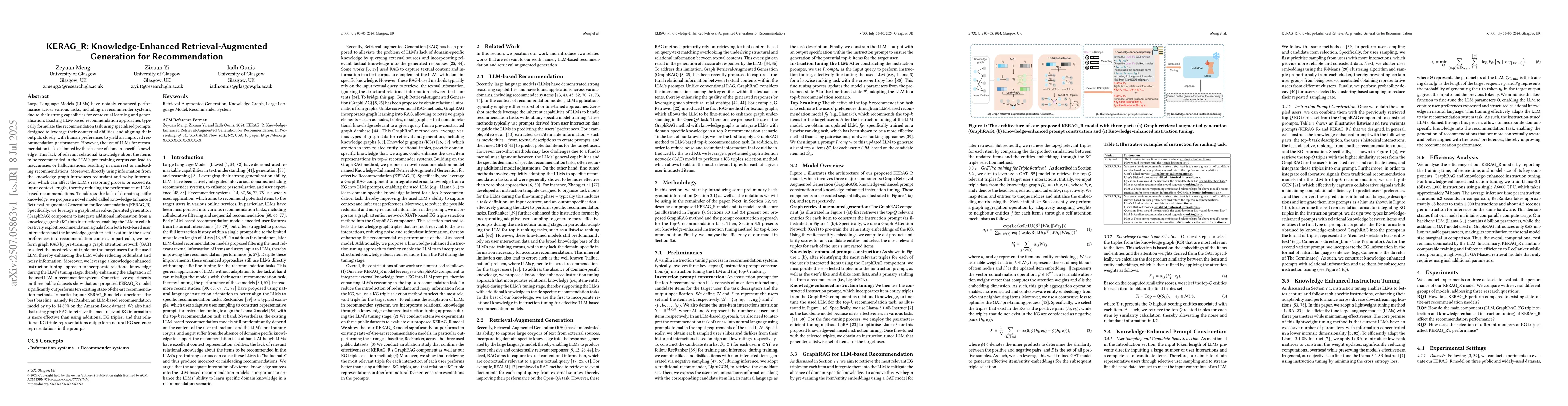 Large Language Models (LLMs) have shown strong potential in recommender systems due to their contextual learning and generalisation capabilities. Existing LLM-based recommendation approaches typically formulate the recommendation task using specialised prompts designed to leverage their contextual abilities, and aligning their outputs closely with human preferences to yield an improved recommendation performance. However, the use of LLMs for recommendation tasks is limited by the absence of domain-specific knowledge. This lack of relevant relational knowledge about the items to be recommended in the LLM's pre-training corpus can lead to inaccuracies or hallucinations, resulting in incorrect or misleading recommendations. Moreover, directly using information from the knowledge graph introduces redundant and noisy information, which can affect the LLM's reasoning process or exceed its input context length, thereby reducing the performance of LLM-based recommendations. To address the lack of domain-specific knowledge, we propose a novel model called Knowledge-Enhanced Retrieval-Augmented Generation for Recommendation (KERAG_R). Specifically, we leverage a graph retrieval-augmented generation (GraphRAG) component to integrate additional information from a knowledge graph (KG) into instructions, enabling the LLM to collaboratively exploit recommendation signals from both text-based user interactions and the knowledge graph to better estimate the users' preferences in a recommendation context. In particular, we perform graph RAG by pre-training a graph attention network (GAT) to select the most relevant triple for the target users for the used LLM, thereby enhancing the LLM while reducing redundant and noisy information. Our extensive experiments on three public datasets show that our proposed KERAG_R model significantly outperforms ten existing state-of-the-art recommendation methods.