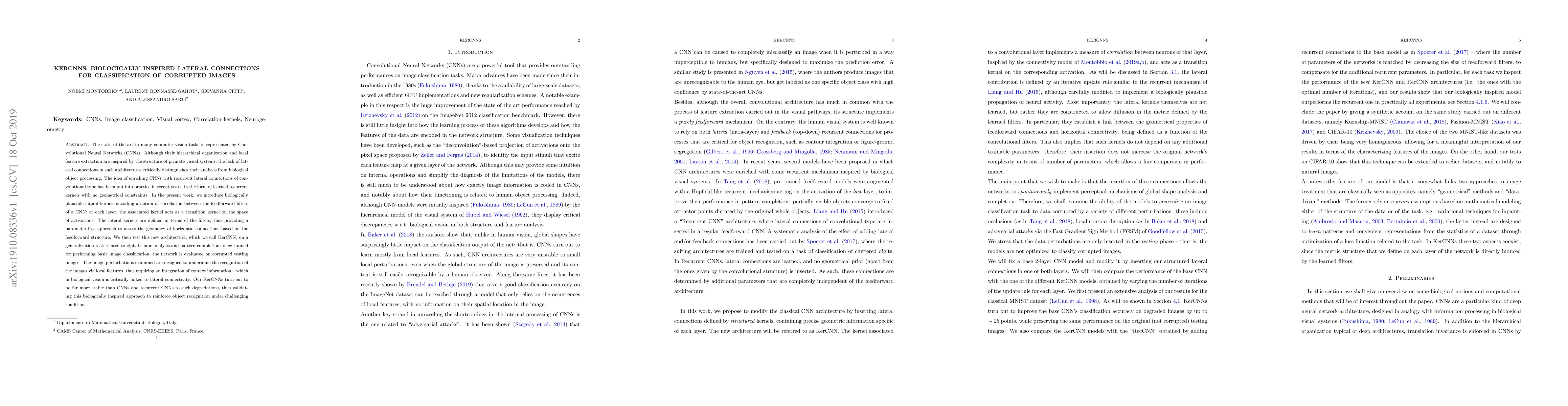 KerCNNs introduce biologically plausible lateral connections to enhance CNNs' robustness to image corruption by integrating contextual information. This approach, based on lateral kernels derived from feedforward filters, significantly improves performance on tasks requiring pattern completion and global shape analysis under degraded conditions.
