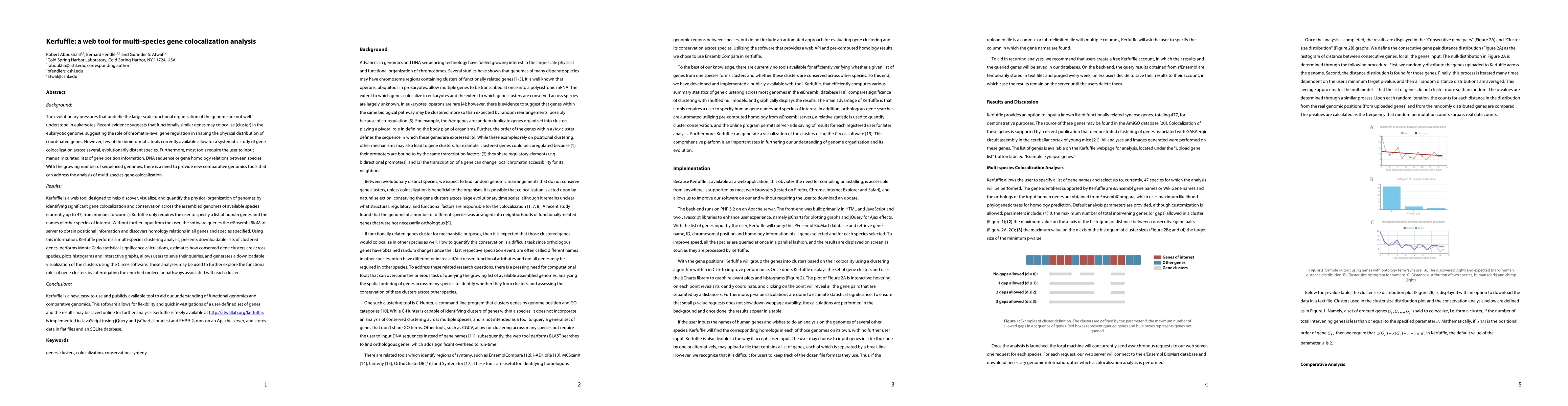 A web tool called Kerfuffle helps discover and visualize the physical organization of genomes by identifying significant gene colocalization and conservation across multiple species. It allows users to specify human genes and other species of interest, performing multi-species clustering analysis and generating visualizations to explore functional roles of gene clusters.