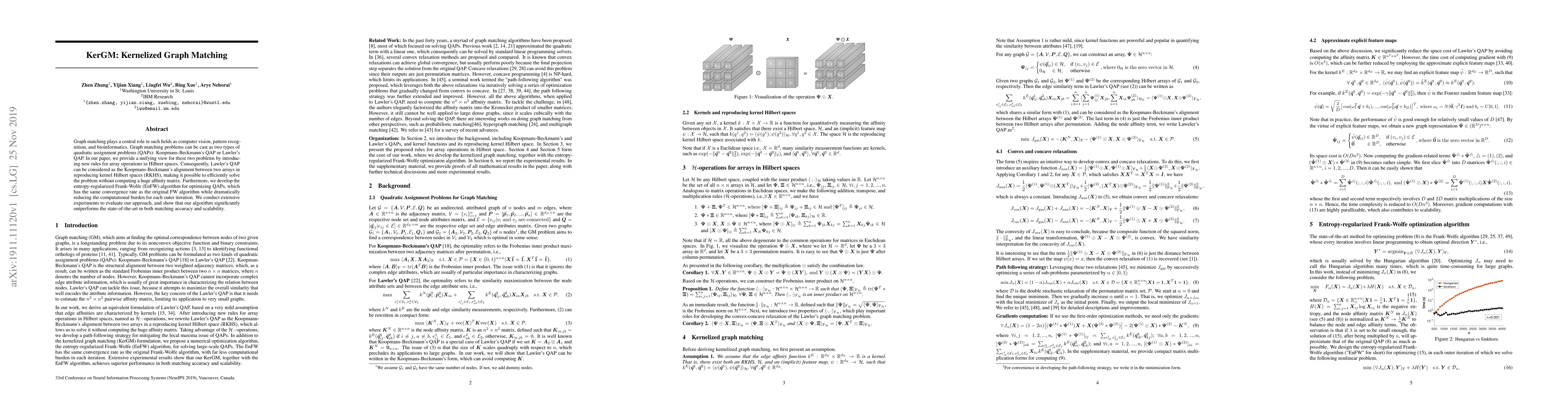 This paper presents KerGM, a method unifying two graph matching problems into a single framework using kernelized array operations in Hilbert spaces. It introduces an entropy-regularized Frank-Wolfe algorithm (EnFW) for efficient optimization, significantly outperforming existing methods in accuracy and scalability for graph matching tasks.