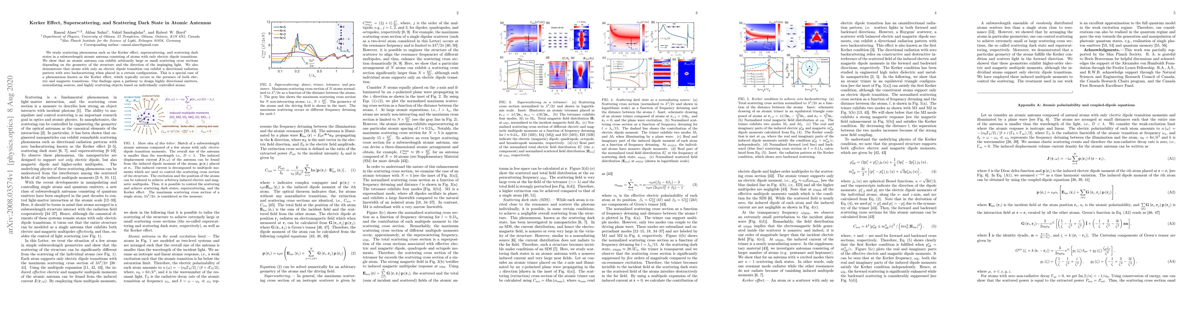 We study scattering phenomena such as the Kerker effect, superscattering, and scattering dark states in a subwavelength atomic antenna consisting of atoms with only electric dipole transitions. We show that an atomic antenna can exhibit arbitrarily large or small scattering cross sections depending on the geometry of the structure and the direction of the impinging light. We also demonstrate that atoms with only an electric dipole transition can exhibit a directional radiation pattern with zero backscattering when placed in a certain configuration. This is a special case of a phenomenon known as the Kerker effect, which typically occurs in the presence of both electric and magnetic transitions. Our findings open a pathway to design highly directional emitters, nonradiating sources, and highly scattering objects based on individually controlled atoms.