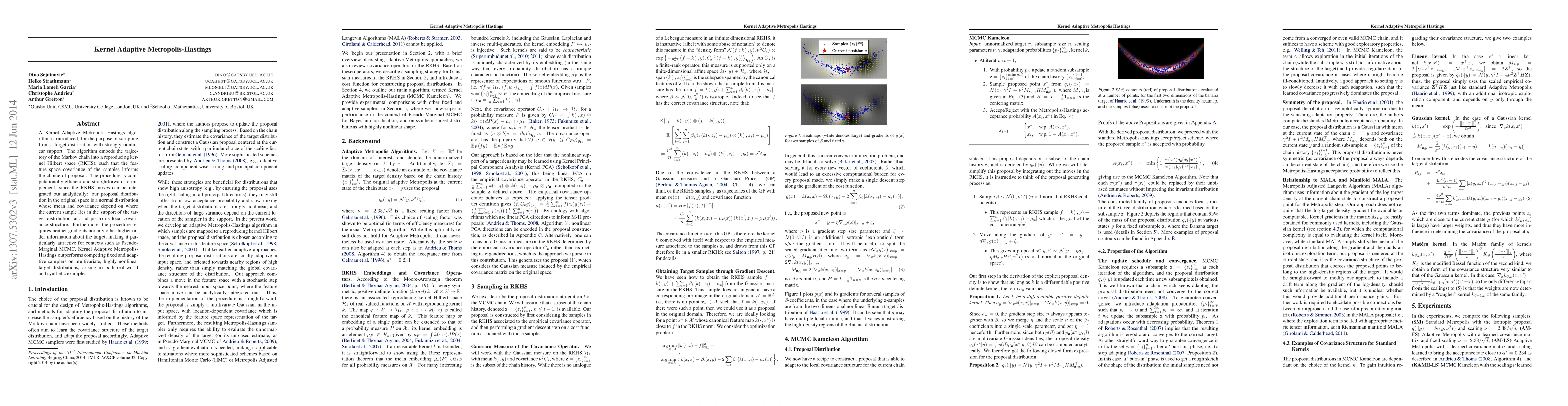 The Kernel Adaptive Metropolis-Hastings algorithm samples from complex target distributions by embedding Markov chain trajectories in a reproducing kernel Hilbert space, adapting the proposal distribution based on local covariance without requiring gradients. It outperforms other samplers on nonlinear, multivariate distributions.