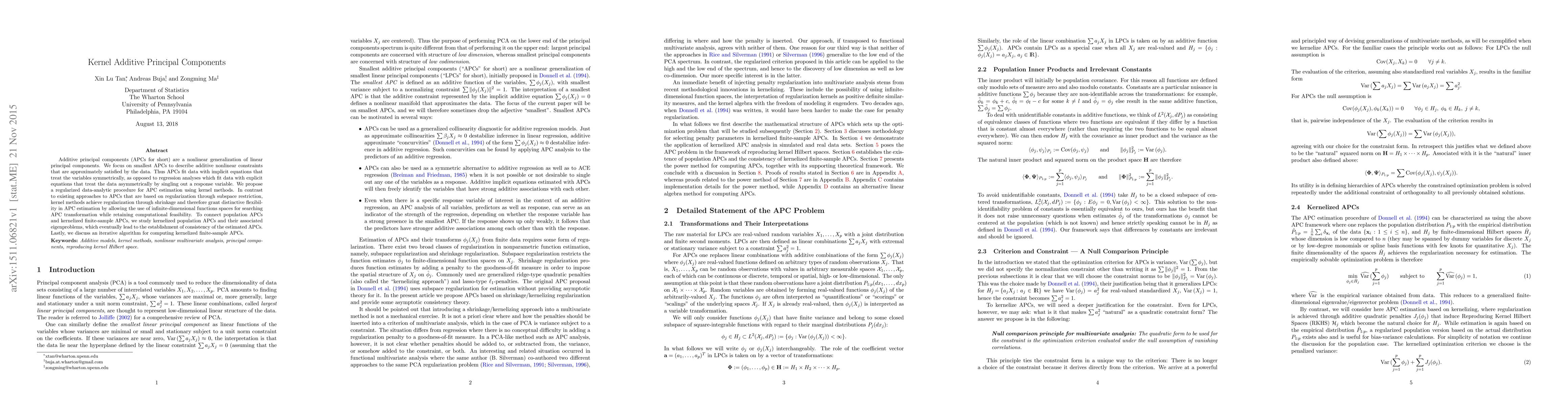 Additive principal components (APCs for short) are a nonlinear generalization of linear principal components. We focus on smallest APCs to describe additive nonlinear constraints that are approximately satisfied by the data. Thus APCs fit data with implicit equations that treat the variables symmetrically, as opposed to regression analyses which fit data with explicit equations that treat the data asymmetrically by singling out a response variable. We propose a regularized data-analytic procedure for APC estimation using kernel methods. In contrast to existing approaches to APCs that are based on regularization through subspace restriction, kernel methods achieve regularization through shrinkage and therefore grant distinctive flexibility in APC estimation by allowing the use of infinite-dimensional functions spaces for searching APC transformation while retaining computational feasibility. To connect population APCs and kernelized finite-sample APCs, we study kernelized population APCs and their associated eigenproblems, which eventually lead to the establishment of consistency of the estimated APCs. Lastly, we discuss an iterative algorithm for computing kernelized finite-sample APCs.
