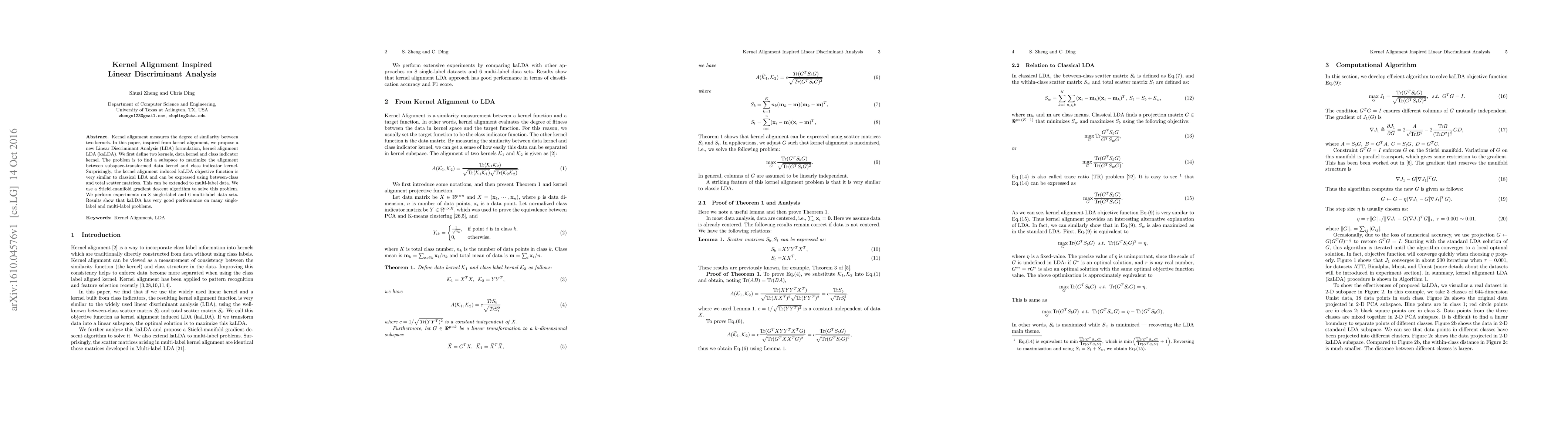 The paper proposes kernel alignment LDA (kaLDA), a new LDA formulation inspired by kernel alignment, which maximizes the similarity between a subspace-transformed data kernel and a class indicator kernel, showing performance comparable to classical LDA and effective on both single-label and multi-label datasets.