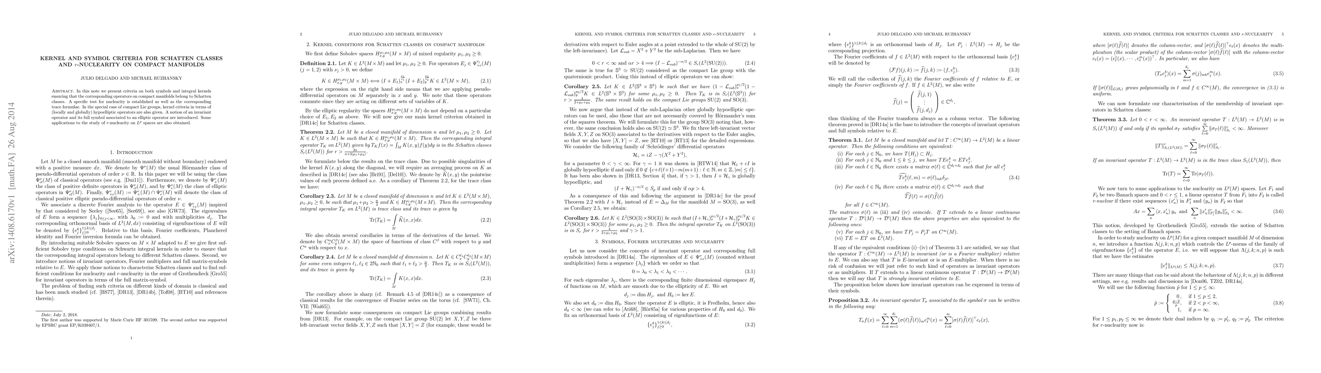 This paper presents criteria for determining when operators on compact manifolds belong to Schatten classes based on their symbols and integral kernels, establishing specific tests for nuclearity and trace formulae. It introduces notions of invariant operators and their full symbols for elliptic operators, with applications to $r$-nuclearity on $L^p$ spaces and criteria for compact Lie groups involving hypoelliptic operators.
