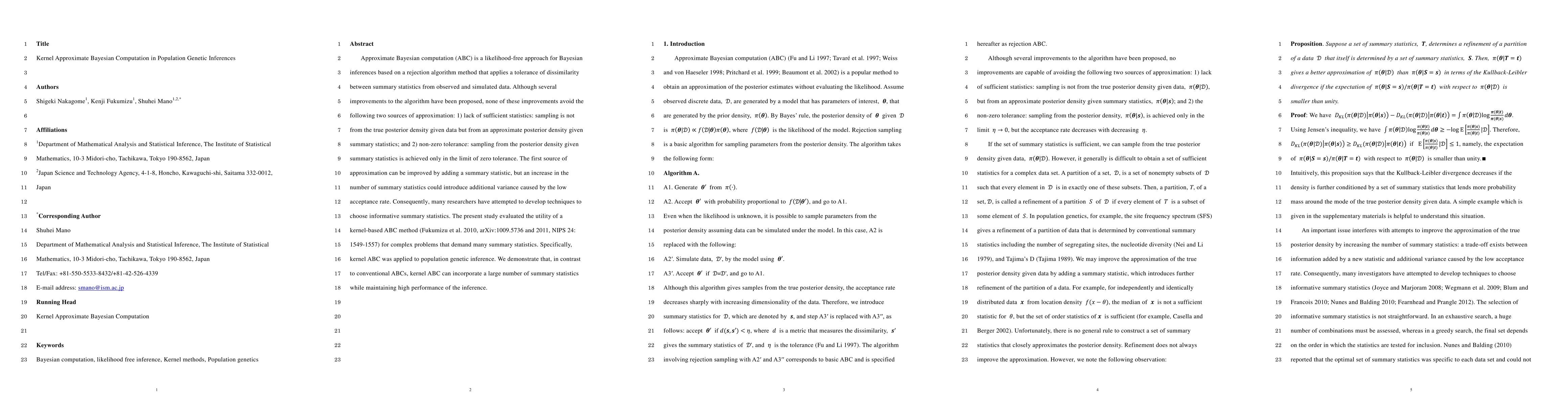 This paper evaluates a kernel-based Approximate Bayesian Computation (ABC) method for population genetic inference, demonstrating its ability to handle many summary statistics effectively while maintaining high inference performance, unlike conventional ABC methods.