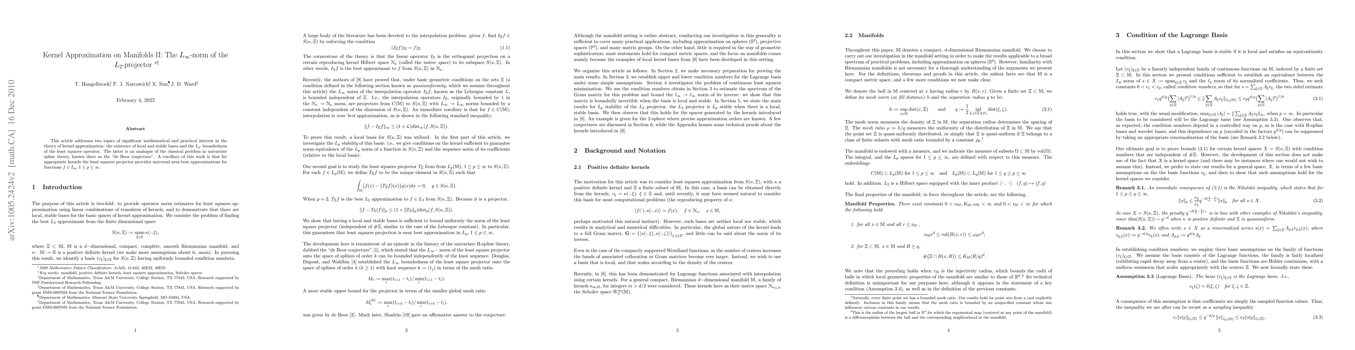 This article addresses two topics of significant mathematical and practical interest in the theory of kernel approximation: the existence of local and stable bases and the L_p--boundedness of the least squares operator. The latter is an analogue of the classical problem in univariate spline theory, known there as the "de Boor conjecture". A corollary of this work is that for appropriate kernels the least squares projector provides universal near-best approximations for functions f\in L_p, 1\le p\le \infty.